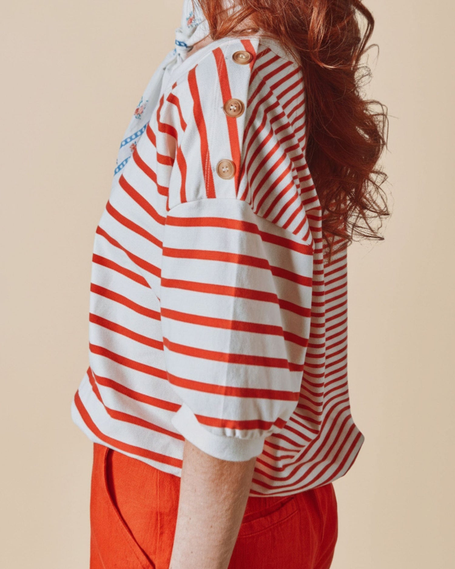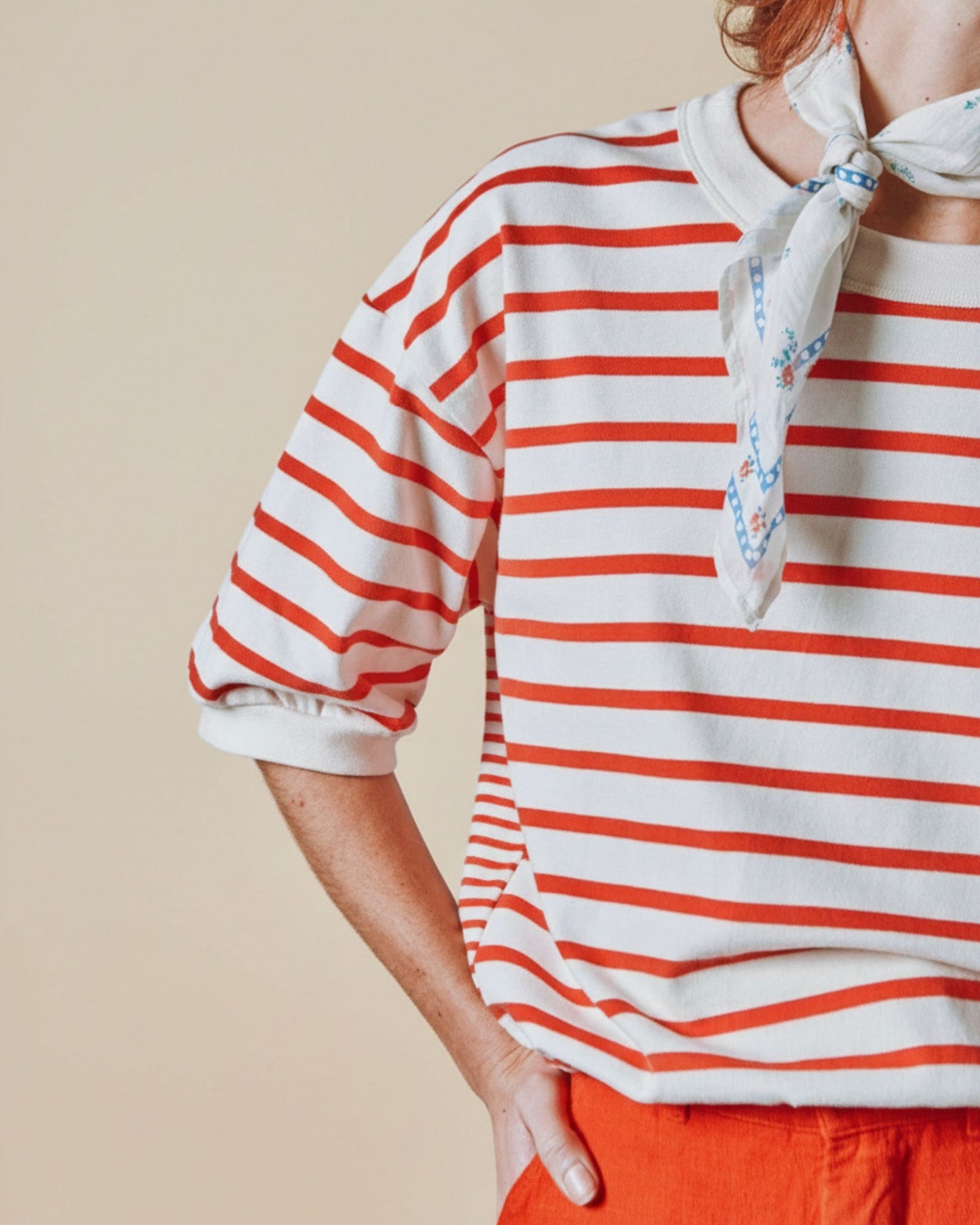 Short-sleeved sweatshirt in organic cotton fleece with red and ecru stripes.