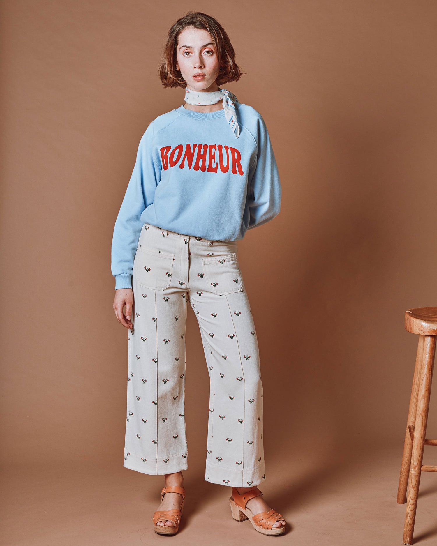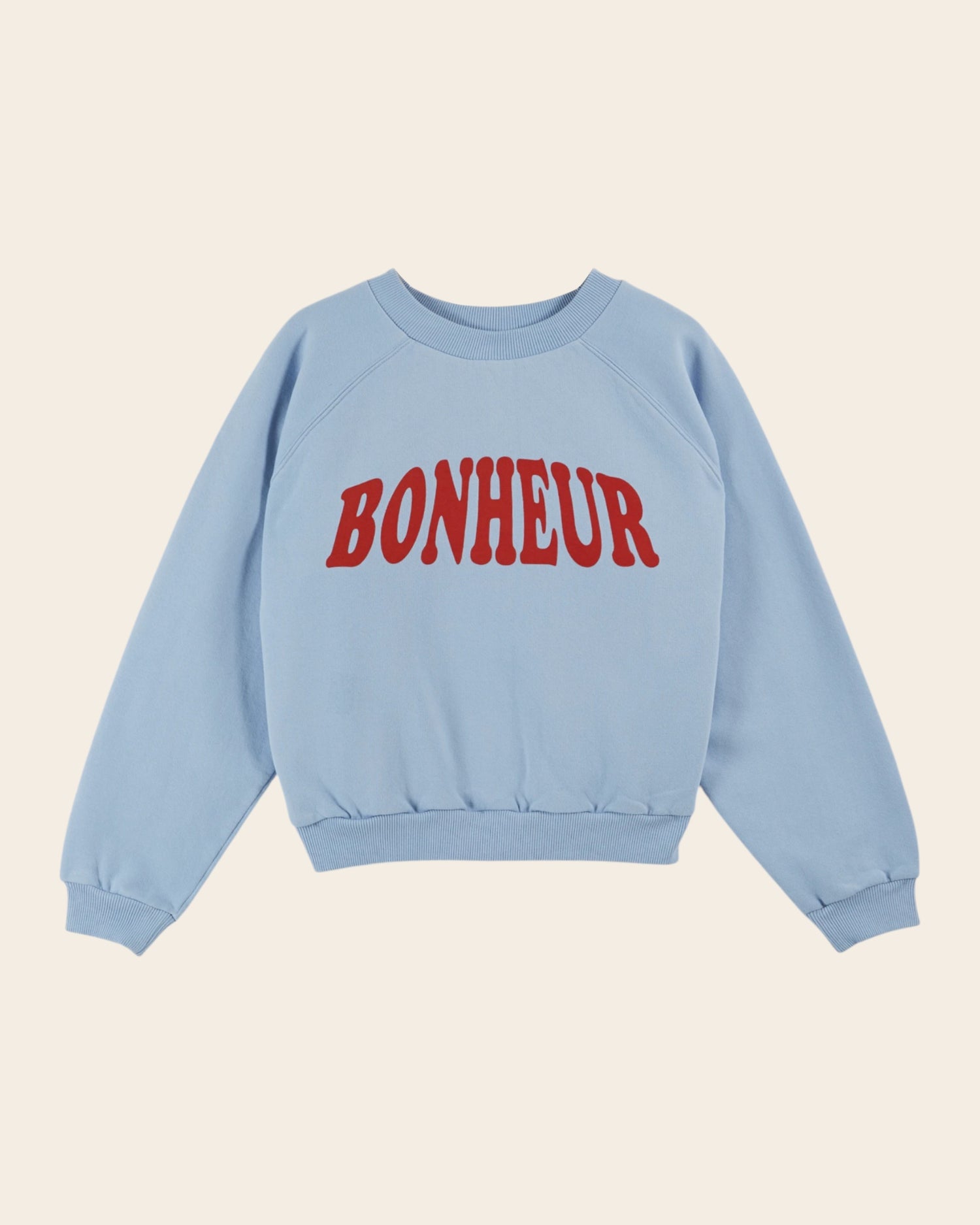 Short sweatshirt in sky blue organic cotton fleece jersey printed on the front “Bonheur" in red.