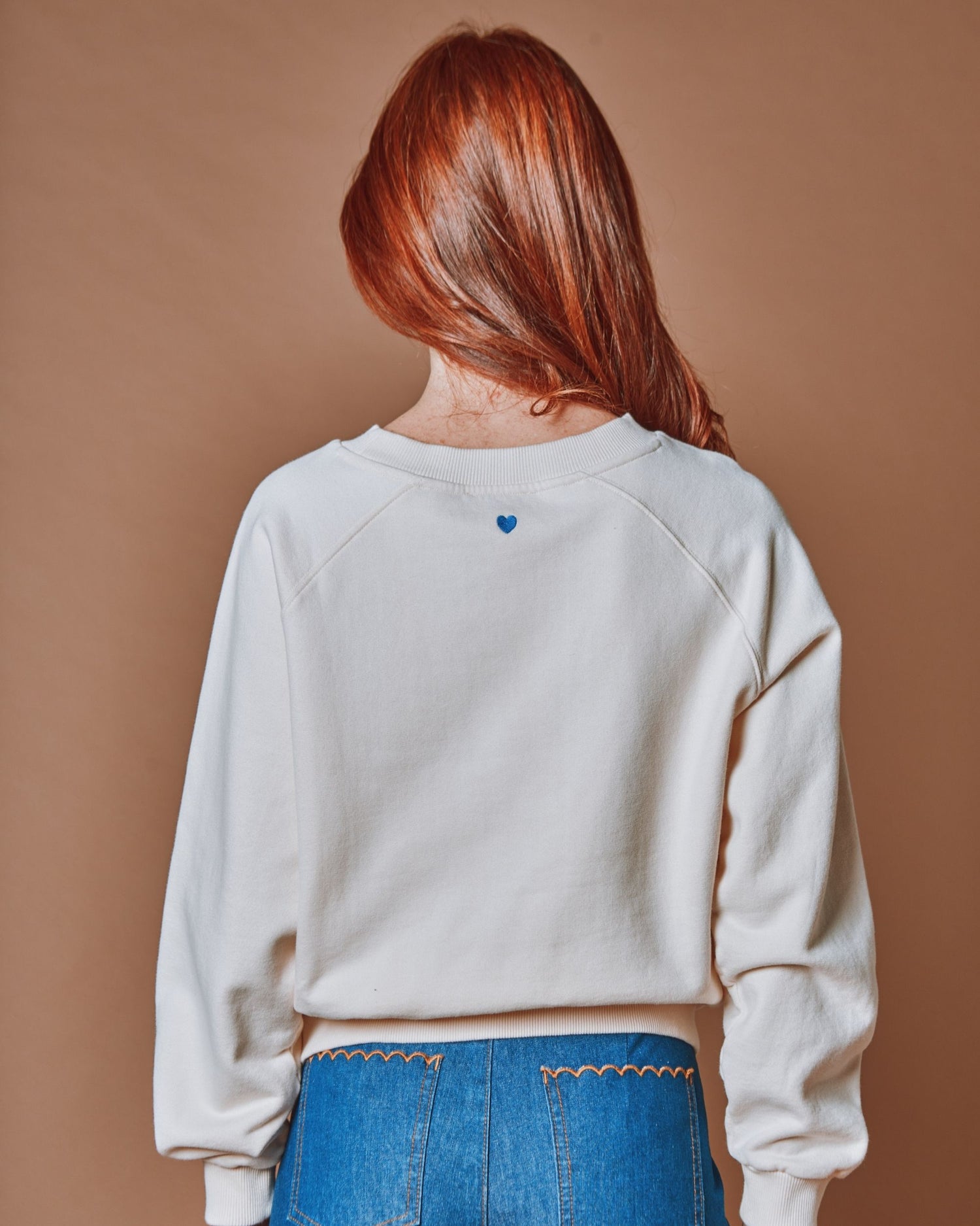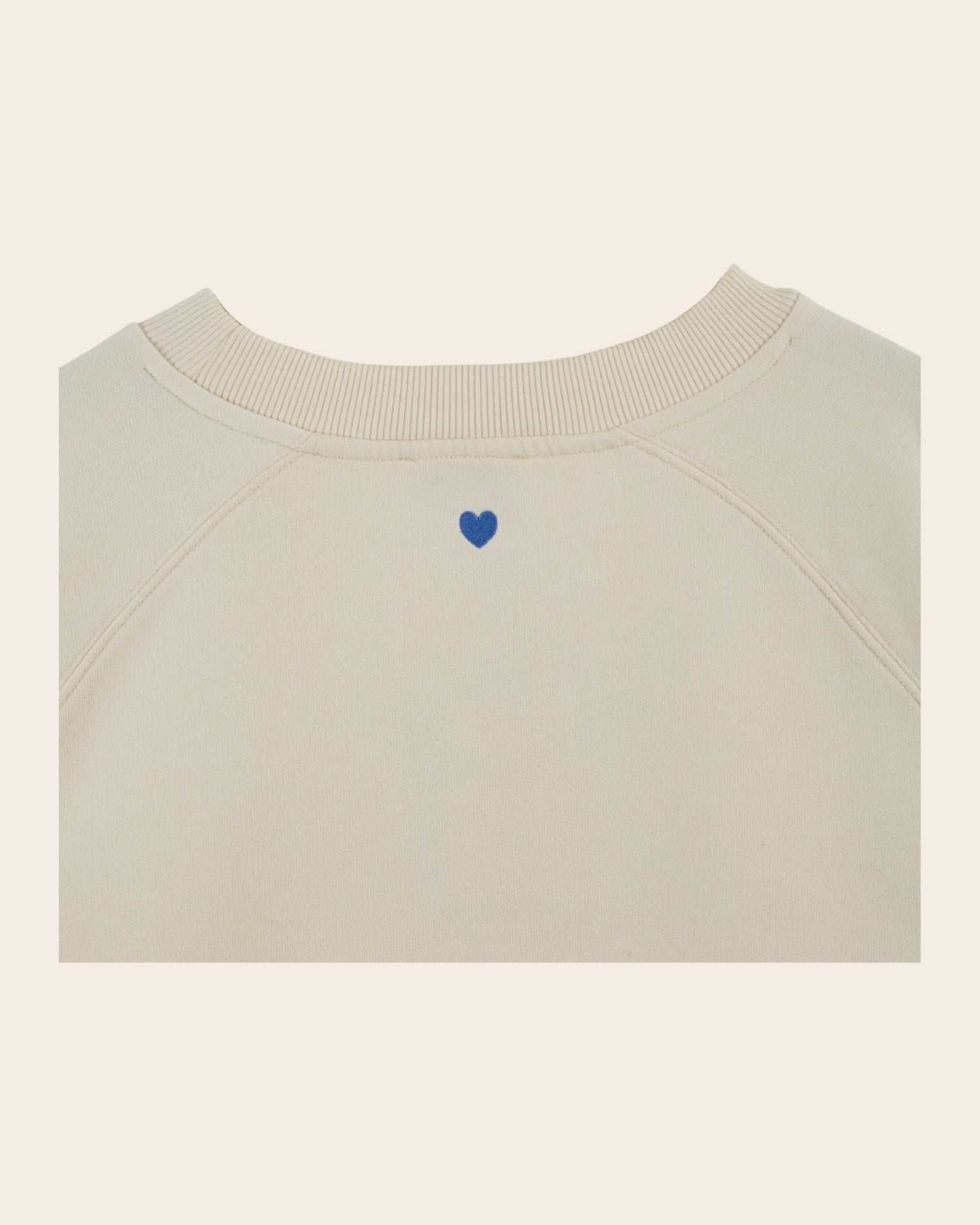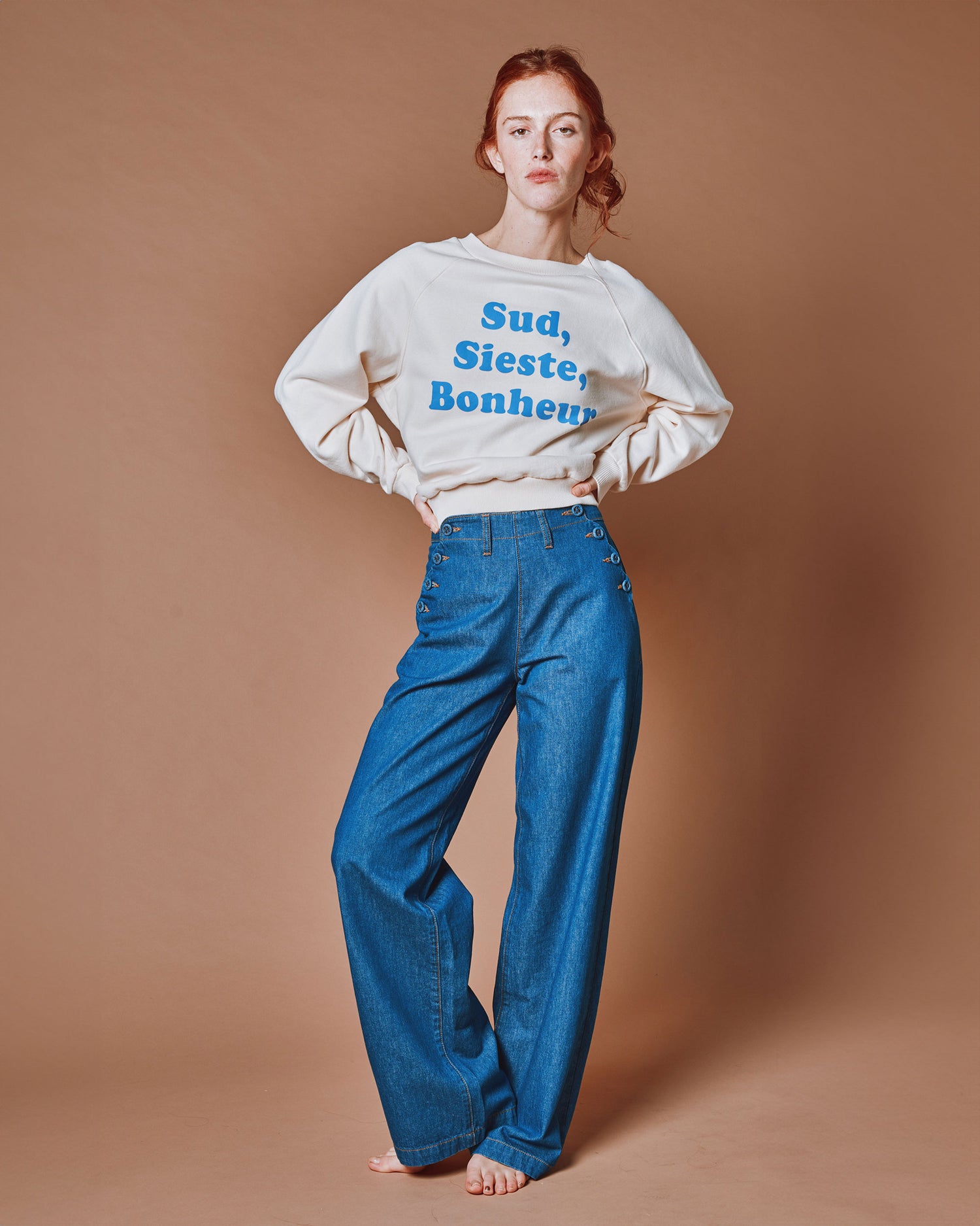 Short sweatshirt in cream organic cotton jersey fleece with “Sud, Sieste, Bonheur” printed in blue on the front.