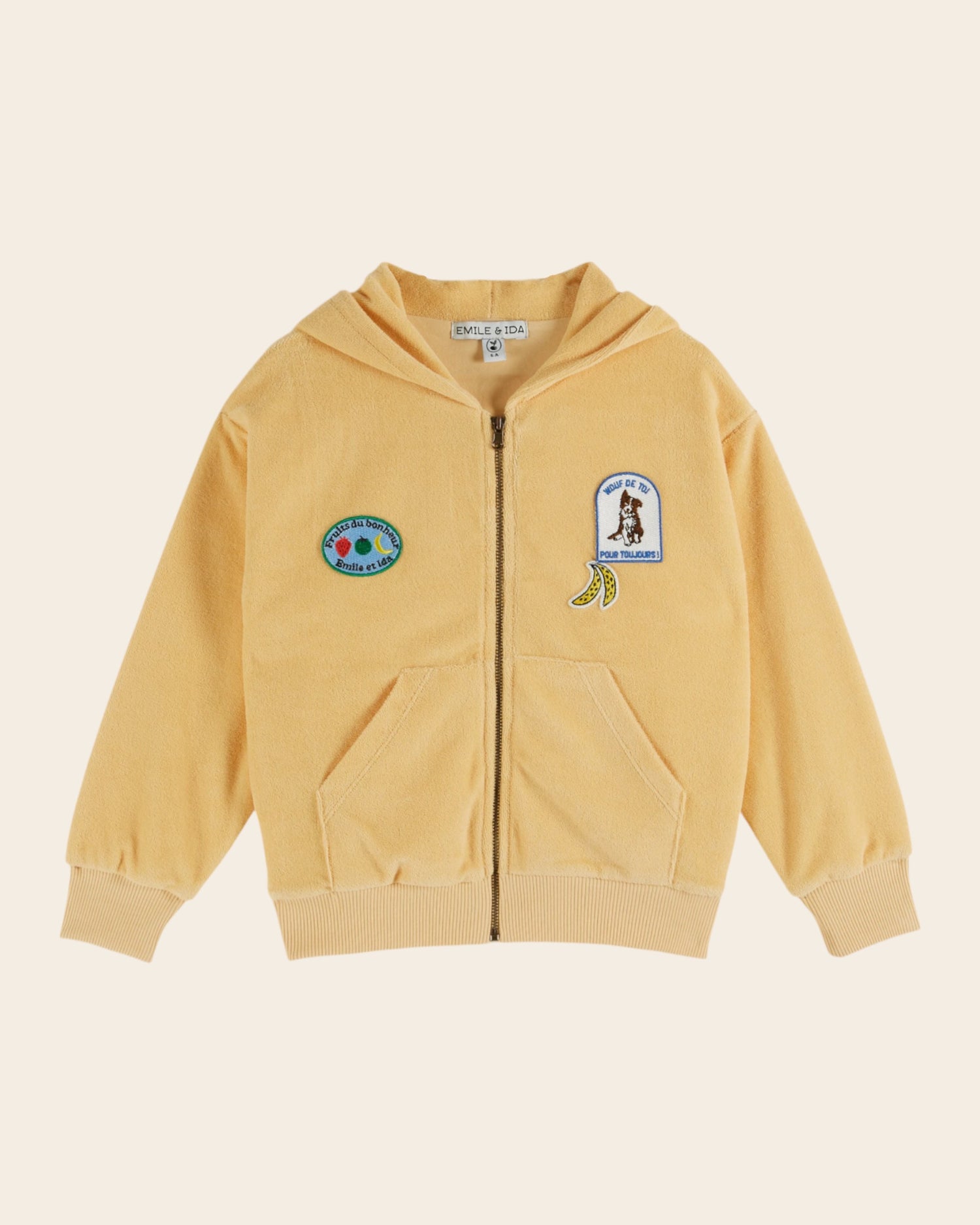 {"id":9679284142409,"title":"Sweat à capuche - Jaune","handle":"sweat-zippe-poussin","description":"\u003cp\u003eSweatshirt à capuche en velours de coton biologique jaune poussin agrémenté de trois badges sur la poitrine. \n\u003cbr\u003e- Matière d'une grande douceur à l'extérieur comme à l'intérieur\n\u003cbr\u003e- Capuche doublée en velours de coton jaune\n\u003cbr\u003e- Poche kangourou scindée en deux par la fermeture à glissière en métal\n\u003cbr\u003e- Bord-côte ton sur ton aux poignets et à la base\n\u003cbr\u003e- Corps et manches doublés en jersey de coton ton sur ton\u003c\/p\u003e","published_at":"2026-02-17T14:14:44+01:00","created_at":"2025-05-26T14:03:55+02:00","vendor":"Ramil Confecoes","type":"Sweats","tags":["badge: coton bio","boy","coton bio","FM-AD161-POUSSIN","FM-SPLIT_MASTER_COLOR","GARCON","SS26","SS26-KID","SWEATSHIRTS"],"price":9500,"price_min":9500,"price_max":9900,"available":true,"price_varies":true,"compare_at_price":null,"compare_at_price_min":0,"compare_at_price_max":0,"compare_at_price_varies":false,"variants":[{"id":52374601859401,"title":"02A","option1":"02A","option2":null,"option3":null,"sku":"AD161-POUSSIN-02A#282462","requires_shipping":true,"taxable":true,"featured_image":null,"available":true,"name":"Sweat à capuche - Jaune - 02A","public_title":"02A","options":["02A"],"price":9500,"weight":233,"compare_at_price":null,"inventory_management":"shopify","barcode":"3664547670965","requires_selling_plan":false,"selling_plan_allocations":[]},{"id":52434699059529,"title":"03A","option1":"03A","option2":null,"option3":null,"sku":"AD161-POUSSIN-03A#286465","requires_shipping":true,"taxable":true,"featured_image":null,"available":true,"name":"Sweat à capuche - Jaune - 03A","public_title":"03A","options":["03A"],"price":9500,"weight":233,"compare_at_price":null,"inventory_management":"shopify","barcode":"3664547670996","requires_selling_plan":false,"selling_plan_allocations":[]},{"id":52434699092297,"title":"04A","option1":"04A","option2":null,"option3":null,"sku":"AD161-POUSSIN-04A#286467","requires_shipping":true,"taxable":true,"featured_image":null,"available":true,"name":"Sweat à capuche - Jaune - 04A","public_title":"04A","options":["04A"],"price":9500,"weight":233,"compare_at_price":null,"inventory_management":"shopify","barcode":"3664547671016","requires_selling_plan":false,"selling_plan_allocations":[]},{"id":52434699125065,"title":"05A","option1":"05A","option2":null,"option3":null,"sku":"AD161-POUSSIN-05A#286469","requires_shipping":true,"taxable":true,"featured_image":null,"available":true,"name":"Sweat à capuche - Jaune - 05A","public_title":"05A","options":["05A"],"price":9500,"weight":233,"compare_at_price":null,"inventory_management":"shopify","barcode":"3664547671030","requires_selling_plan":false,"selling_plan_allocations":[]},{"id":52434699157833,"title":"06A","option1":"06A","option2":null,"option3":null,"sku":"AD161-POUSSIN-06A#286471","requires_shipping":true,"taxable":true,"featured_image":null,"available":true,"name":"Sweat à capuche - Jaune - 06A","public_title":"06A","options":["06A"],"price":9500,"weight":233,"compare_at_price":null,"inventory_management":"shopify","barcode":"3664547671054","requires_selling_plan":false,"selling_plan_allocations":[]},{"id":52434699190601,"title":"08A","option1":"08A","option2":null,"option3":null,"sku":"AD161-POUSSIN-08A#286473","requires_shipping":true,"taxable":true,"featured_image":null,"available":true,"name":"Sweat à capuche - Jaune - 08A","public_title":"08A","options":["08A"],"price":9900,"weight":233,"compare_at_price":null,"inventory_management":"shopify","barcode":"3664547671078","requires_selling_plan":false,"selling_plan_allocations":[]},{"id":52434699223369,"title":"10A","option1":"10A","option2":null,"option3":null,"sku":"AD161-POUSSIN-10A#286475","requires_shipping":true,"taxable":true,"featured_image":null,"available":true,"name":"Sweat à capuche - Jaune - 10A","public_title":"10A","options":["10A"],"price":9900,"weight":233,"compare_at_price":null,"inventory_management":"shopify","barcode":"3664547671092","requires_selling_plan":false,"selling_plan_allocations":[]}],"images":["\/\/www.emileetida.com\/cdn\/shop\/files\/AD161-poussin-01.jpg?v=1767715725","\/\/www.emileetida.com\/cdn\/shop\/files\/AD161-poussin-02.jpg?v=1767715725","\/\/www.emileetida.com\/cdn\/shop\/files\/AD161-poussin-03_87346273-a816-4288-a18b-c82773b59c8f.jpg?v=1767781087","\/\/www.emileetida.com\/cdn\/shop\/files\/AD161-poussin-04_29297810-f0bc-480a-802f-6876e2e31965.jpg?v=1767781086"],"featured_image":"\/\/www.emileetida.com\/cdn\/shop\/files\/AD161-poussin-01.jpg?v=1767715725","options":["Taille"],"media":[{"alt":null,"id":55413358297417,"position":1,"preview_image":{"aspect_ratio":0.8,"height":2500,"width":2000,"src":"\/\/www.emileetida.com\/cdn\/shop\/files\/AD161-poussin-01.jpg?v=1767715725"},"aspect_ratio":0.8,"height":2500,"media_type":"image","src":"\/\/www.emileetida.com\/cdn\/shop\/files\/AD161-poussin-01.jpg?v=1767715725","width":2000},{"alt":null,"id":55413358330185,"position":2,"preview_image":{"aspect_ratio":0.8,"height":2500,"width":2000,"src":"\/\/www.emileetida.com\/cdn\/shop\/files\/AD161-poussin-02.jpg?v=1767715725"},"aspect_ratio":0.8,"height":2500,"media_type":"image","src":"\/\/www.emileetida.com\/cdn\/shop\/files\/AD161-poussin-02.jpg?v=1767715725","width":2000},{"alt":null,"id":55438400127305,"position":3,"preview_image":{"aspect_ratio":0.8,"height":2500,"width":2000,"src":"\/\/www.emileetida.com\/cdn\/shop\/files\/AD161-poussin-03_87346273-a816-4288-a18b-c82773b59c8f.jpg?v=1767781087"},"aspect_ratio":0.8,"height":2500,"media_type":"image","src":"\/\/www.emileetida.com\/cdn\/shop\/files\/AD161-poussin-03_87346273-a816-4288-a18b-c82773b59c8f.jpg?v=1767781087","width":2000},{"alt":null,"id":55438400160073,"position":4,"preview_image":{"aspect_ratio":0.8,"height":2500,"width":2000,"src":"\/\/www.emileetida.com\/cdn\/shop\/files\/AD161-poussin-04_29297810-f0bc-480a-80