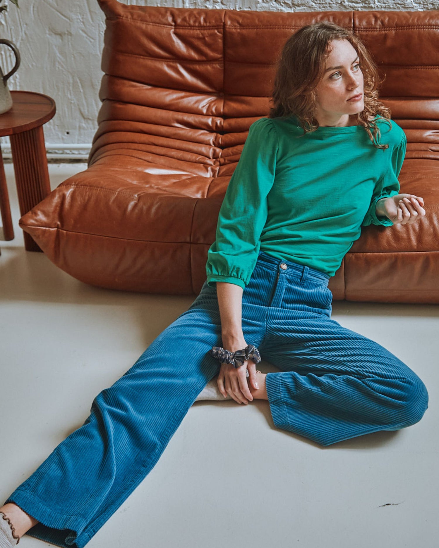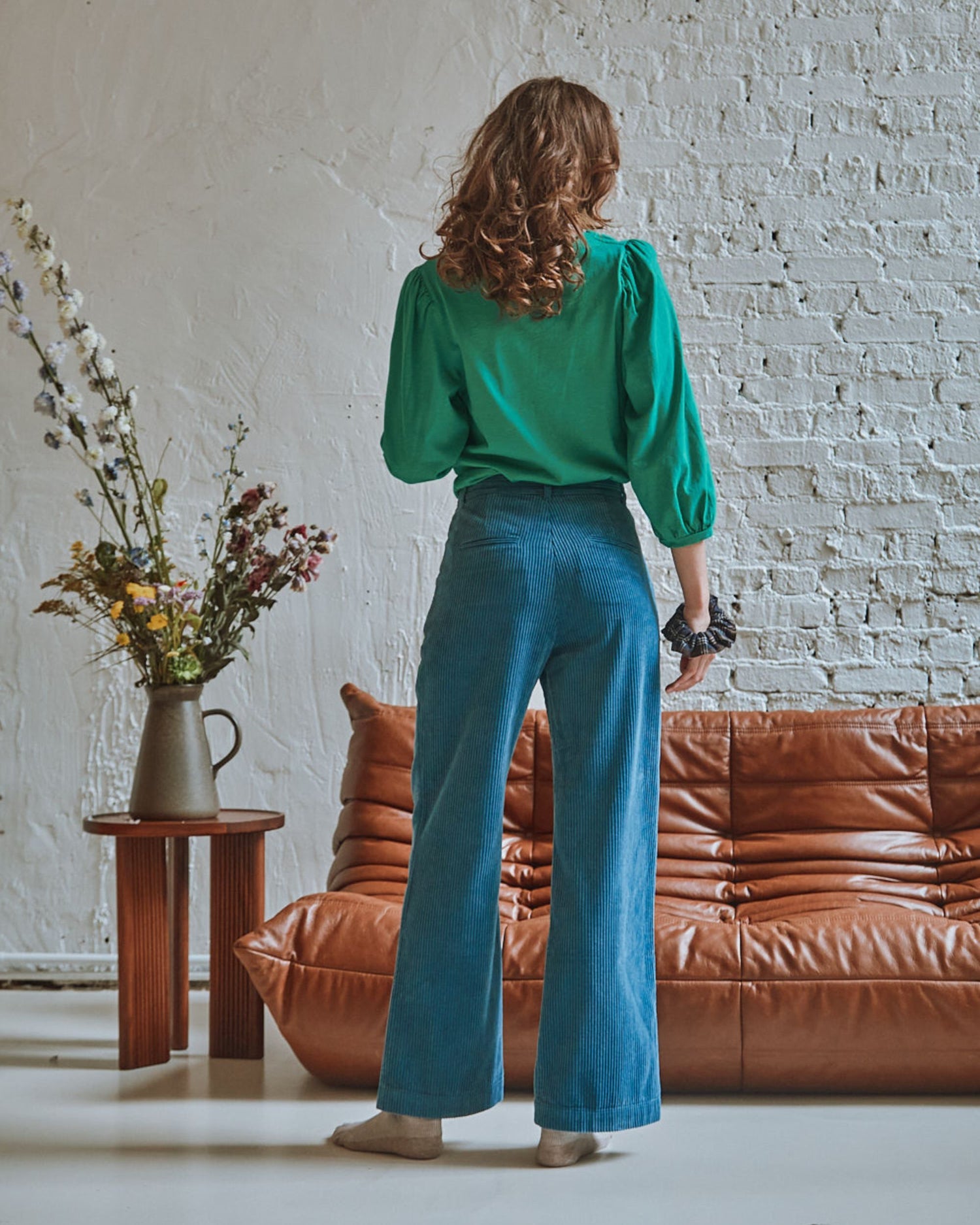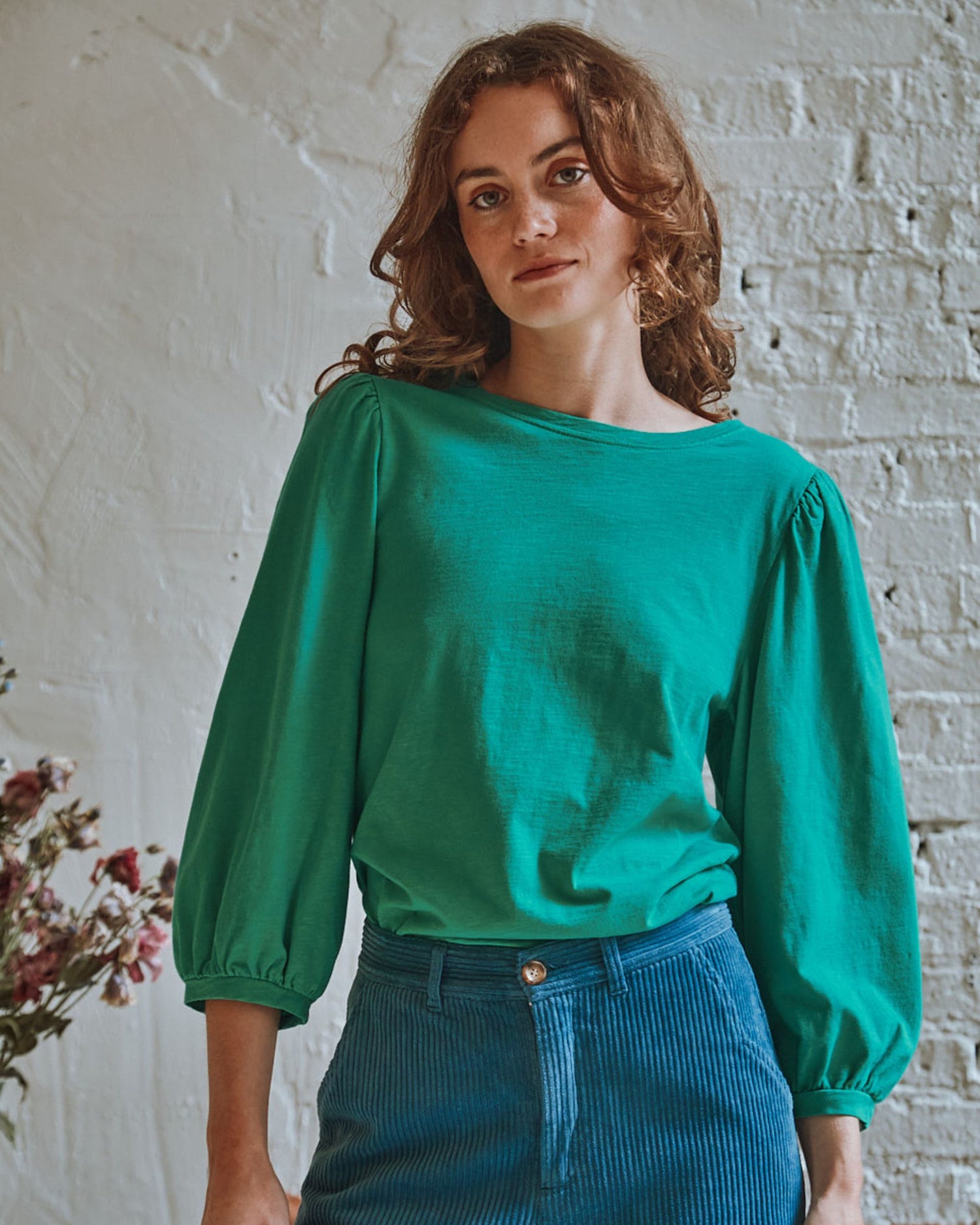 Straight cut, long puffed sleeves, thanks to gathers at the top of the sleeves, tightened at the cuffs. A ribbed band finishes the bottom sleeves and the slightly scalloped neckline.