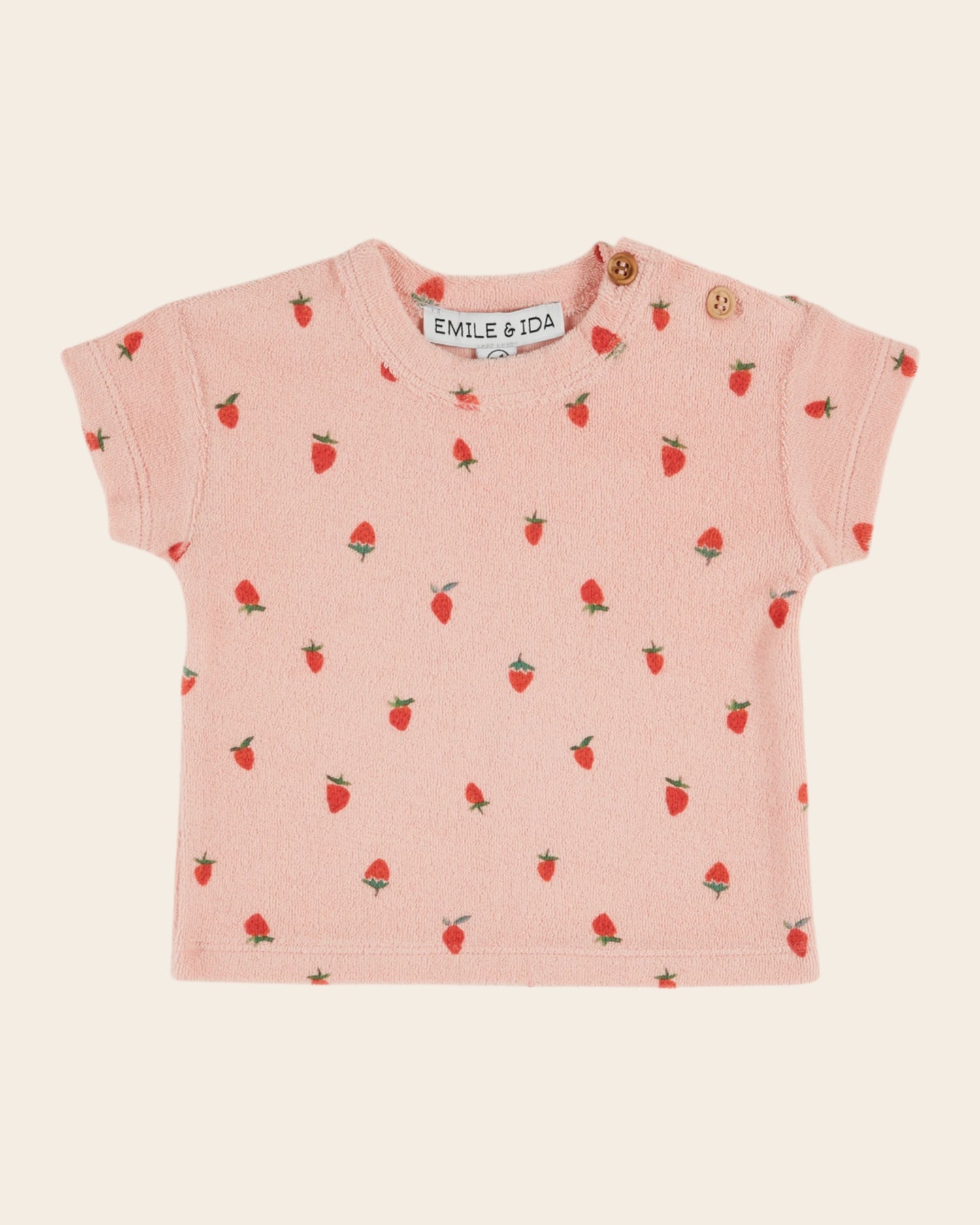 Baby t-shirt in organic cotton velvet and pink mixed fibers printed with ripe strawberries. A t-shirt that delights us while we wait for the strawberries to appear on the market stalls!