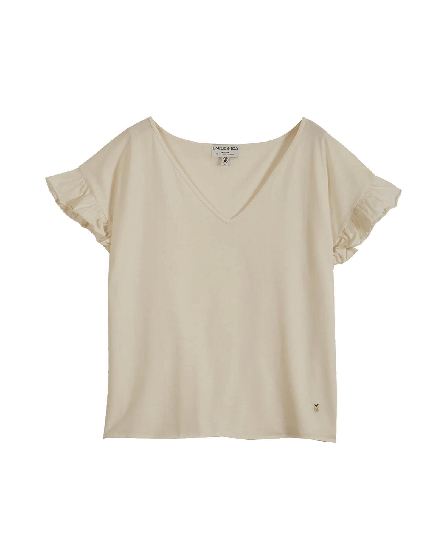 {"id":7524446732508,"title":"Organic cotton jersey ruffled t-shirt in ecru","handle":"tee-shirt-ida-u254_ecru","description":"\u003cp\u003e White organic cotton jersey t-shirt.\u003cbr\u003e \u003cbr\u003eA simple T-shirt that has been a hit for a few years now because it's so cozy, because it doesn't follow fashion, but rather the movements, because you can have the same one as your daughters. A T-shirt with offset armholes that end in a satin-stitch ruffle and a discreetly scooped V-neck.\u003c\/p\u003e\n\n\u003cp\u003e\u003cmeta charset=\"UTF-8\"\u003e \u003cspan\u003eThe\u003c\/span\u003e \u003cspan\u003et-shirt\u003c\/span\u003e \u003cspan\u003eruns large, so don't hesitate to size down.\u003c\/span\u003e\u003c\/p\u003e\n\n\u003cp\u003e Exists for girls.\u003cbr\u003e\u003cbr\u003e Registered design\u003c\/p\u003e","published_at":"2025-11-24T13:03:11+01:00","created_at":"2022-01-11T18:28:52+01:00","vendor":"Only You","type":"T-shirts","tags":["AW25","AW25-WOMAN","badge: coton bio","biologique","coton bio","ECRU","FEMME","FM-IDA-U254-ECRU","IDA-U254-ECRU","IDA-U254_ECRU","permanent","SOLDESH25","SS22","SS22-WOMAN","tee-shirts","tops-tee-shirts","VPH25","WOMAN"],"price":3430,"price_min":3430,"price_max":3430,"available":true,"price_varies":false,"compare_at_price":4900,"compare_at_price_min":4900,"compare_at_price_max":4900,"compare_at_price_varies":false,"variants":[{"id":42305858437340,"title":"XS","option1":"XS","option2":null,"option3":null,"sku":"IDA-U254-ECRU-XS#198039","requires_shipping":true,"taxable":true,"featured_image":null,"available":false,"name":"Organic cotton jersey ruffled t-shirt in ecru - XS","public_title":"XS","options":["XS"],"price":3430,"weight":150,"compare_at_price":4900,"inventory_management":"shopify","barcode":"3664547265147","requires_selling_plan":false,"selling_plan_allocations":[]},{"id":42305858470108,"title":"S","option1":"S","option2":null,"option3":null,"sku":"IDA-U254-ECRU-S#198040","requires_shipping":true,"taxable":true,"featured_image":null,"available":false,"name":"Organic cotton jersey ruffled t-shirt in ecru - S","public_title":"S","options":["S"],"price":3430,"weight":150,"compare_at_price":4900,"inventory_management":"shopify","barcode":"3664547265154","requires_selling_plan":false,"selling_plan_allocations":[]},{"id":42305858502876,"title":"M","option1":"M","option2":null,"option3":null,"sku":"IDA-U254-ECRU-M#198041","requires_shipping":true,"taxable":true,"featured_image":null,"available":true,"name":"Organic cotton jersey ruffled t-shirt in ecru - M","public_title":"M","options":["M"],"price":3430,"weight":150,"compare_at_price":4900,"inventory_management":"shopify","barcode":"3664547265161","requires_selling_plan":false,"selling_plan_allocations":[]},{"id":42305858535644,"title":"L","option1":"L","option2":null,"option3":null,"sku":"IDA-U254-ECRU-L#198042","requires_shipping":true,"taxable":true,"featured_image":null,"available":false,"name":"Organic cotton jersey ruffled t-shirt in ecru - L","public_title":"L","options":["L"],"price":3430,"weight":150,"compare_at_price":4900,"inventory_management":"shopify","barcode":"3664547265178","requires_selling_plan":false,"selling_plan_allocations":[]}],"images":["\/\/www.emileetida.com\/cdn\/shop\/files\/IDA-U254-1.png?v=1763985432","\/\/www.emileetida.com\/cdn\/shop\/products\/IDA-U254_B.jpg?v=1763985432"],"featured_image":"\/\/www.emileetida.com\/cdn\/shop\/files\/IDA-U254-1.png?v=1763985432","options":["Size"],"media":[{"alt":null,"id":54518146826569,"position":1,"preview_image":{"aspect_ratio":0.8,"height":2500,"width":2000,"src":"\/\/www.emileetida.com\/cdn\/shop\/files\/IDA-U254-1.png?v=1763985432"},"aspect_ratio":0.8,"height":2500,"media_type":"image","src":"\/\/www.emileetida.com\/cdn\/shop\/files\/IDA-U254-1.png?v=1763985432","width":2000},{"alt":null,"id":29417513681116,"position":2,"preview_image":{"aspect_ratio":1.0,"height":1072,"width":1072,"src":"\/\/www.emileetida.com\/cdn\/shop\/products\/IDA-U254_B.jpg?v=1763985432"},"aspect_ratio":1.0,"height":1072,"media_type":"image","src":"\/\/www.emileetida.com\/cdn\/shop\/products\/IDA-U254_B.jpg?v=1763985432","width":1072}],"requires_selling_plan":false,"selling_plan_groups":[],"content":"\u003cp\u003e White organic cotton jersey t-shirt.\u003cbr\u003e \u003cbr\u003eA simple T-shirt that has been a hit for a few years now because it's so cozy, because it doesn't follow fashion, but rather the movements, because you can have the same one as your daughters. A T-shirt with offset armholes that end in a satin-stitch ruffle and a discreetly scooped V-neck.\u003c\/p\u003e\n\n\u003cp\u003e\u003cmeta charset=\"UTF-8\"\u003e \u003cspan\u003eThe\u003c\/span\u003e \u003cspan\u003et-shirt\u003c\/span\u003e \u003cspan\u003eruns large, so don't hesitate to size down.\u003c\/span\u003e\u003c\/p\u003e\n\n\u003cp\u003e Exists for girls.\u003cbr\u003e\u003cbr\u003e Registered design\u003c\/p\u003e"}