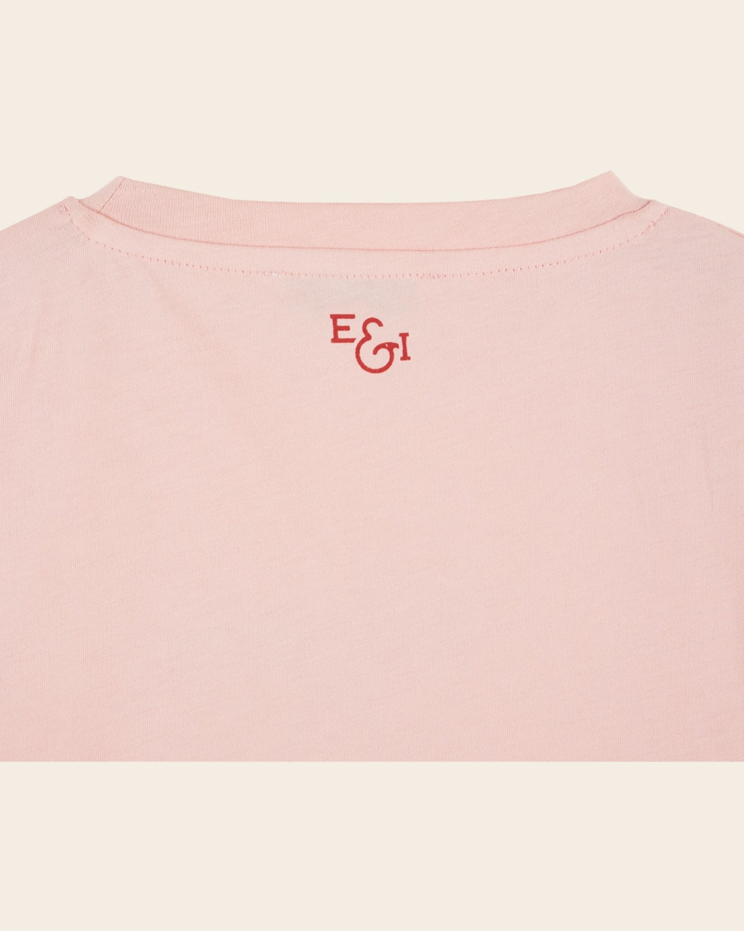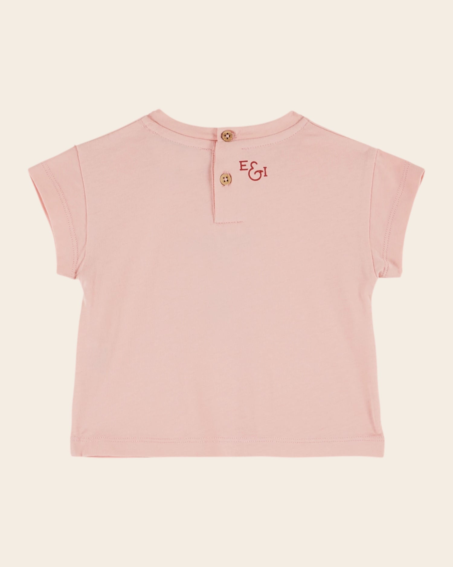 Pink organic cotton jersey T-shirt with a bouquet of red cherries printed on the chest.