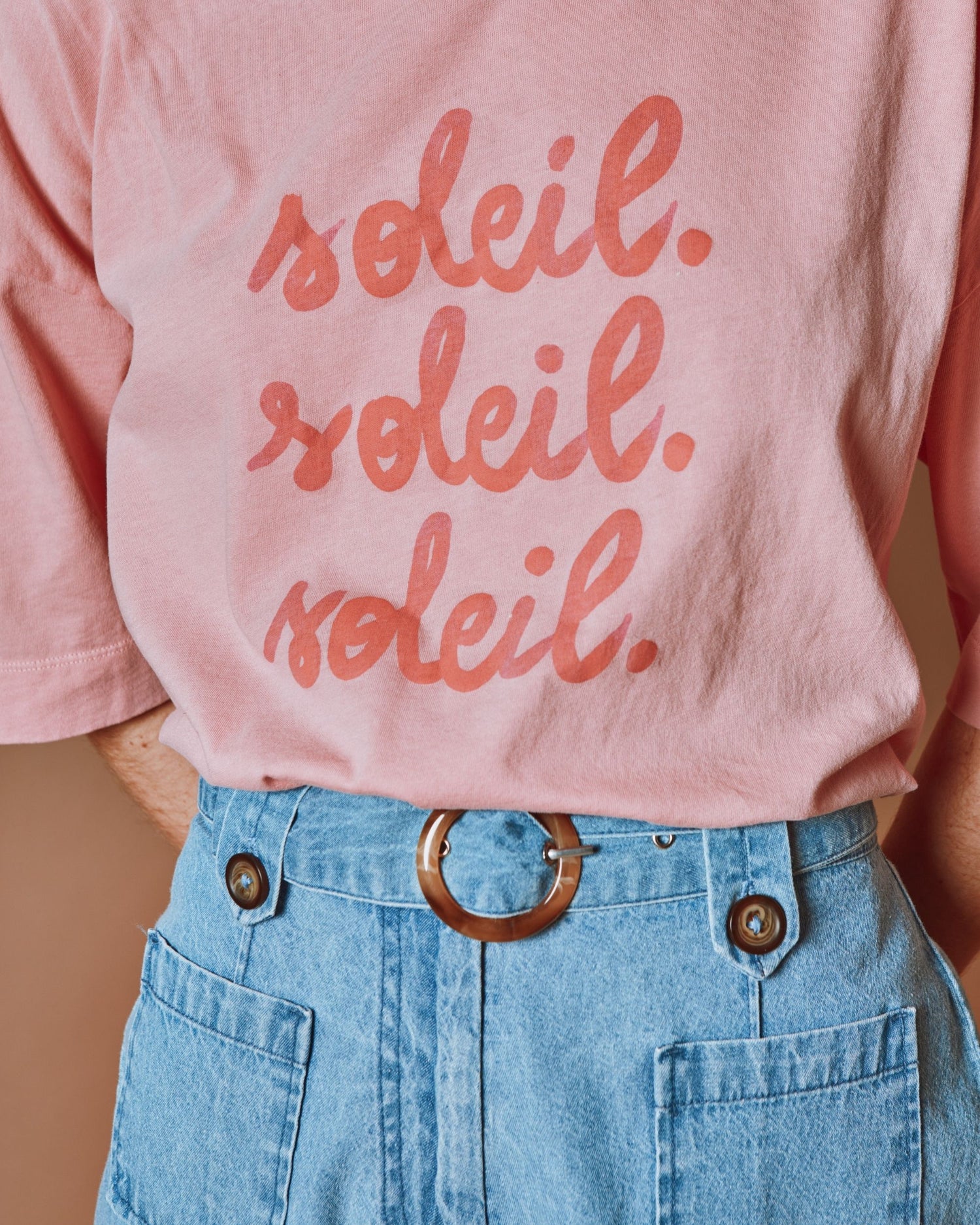 Short-sleeved T-shirt in Indian pink organic cotton jersey with “Soleil. Soleil. Soleil.” printed on the front and illustrations on the back that inspire vacations “sous le soleil”.