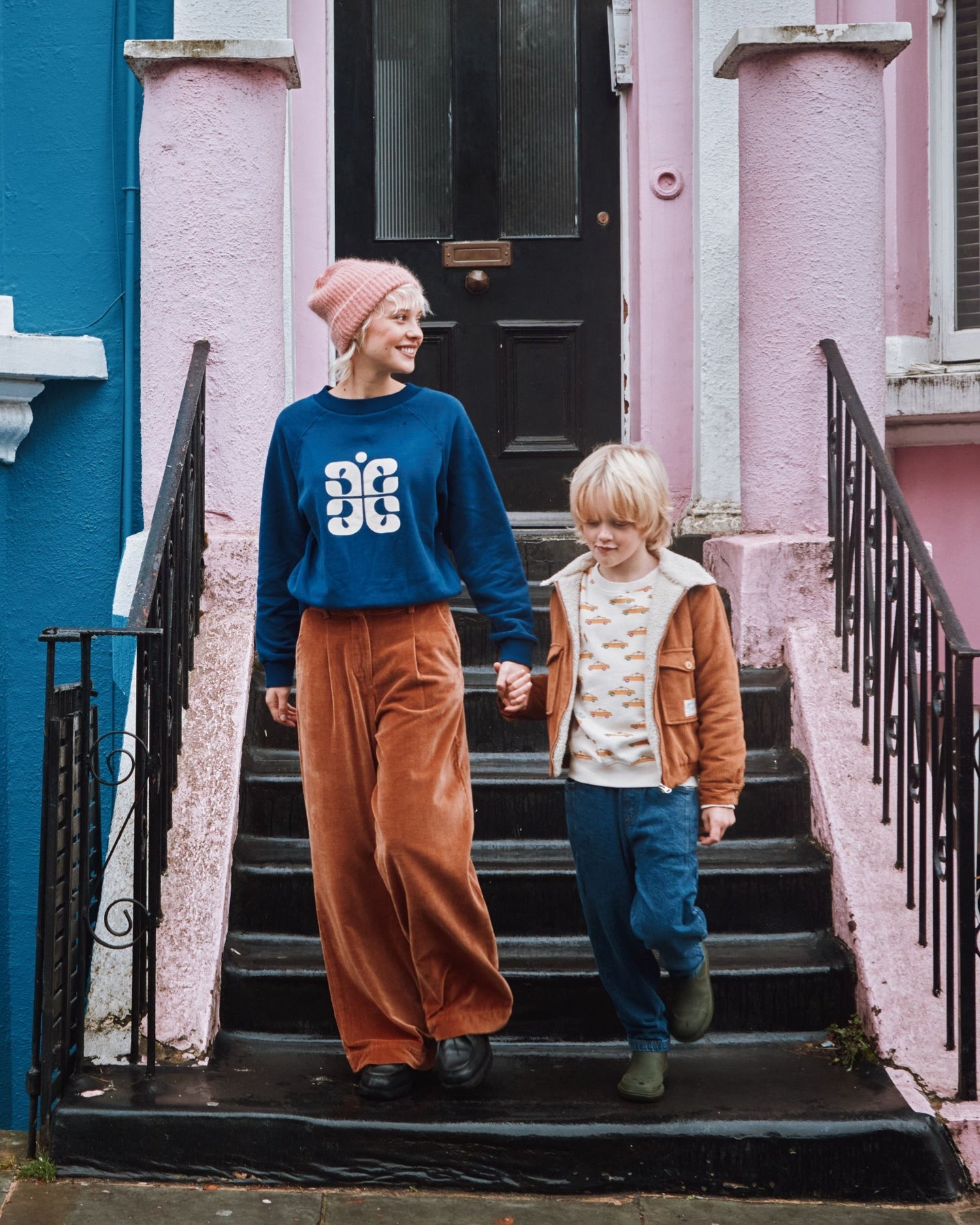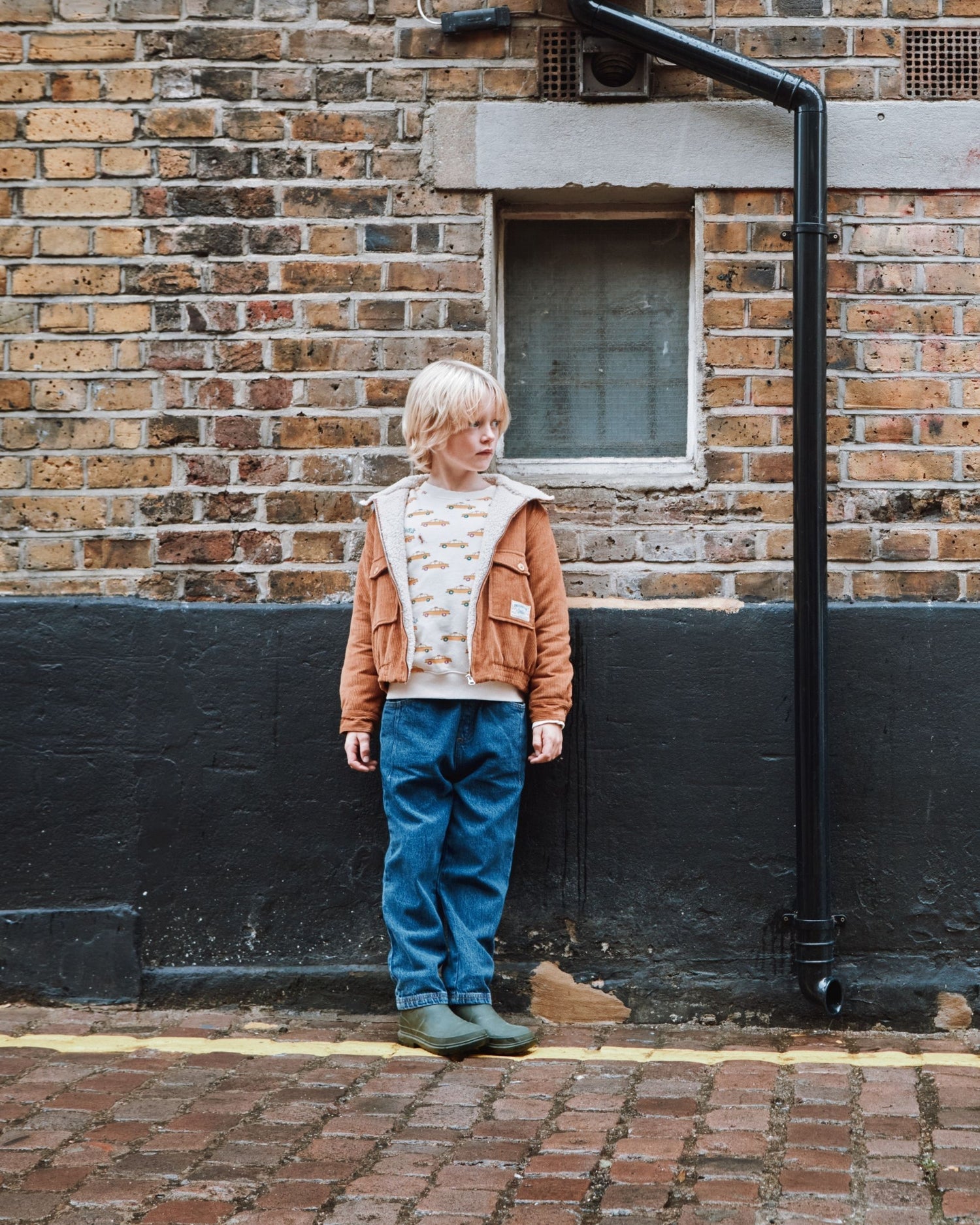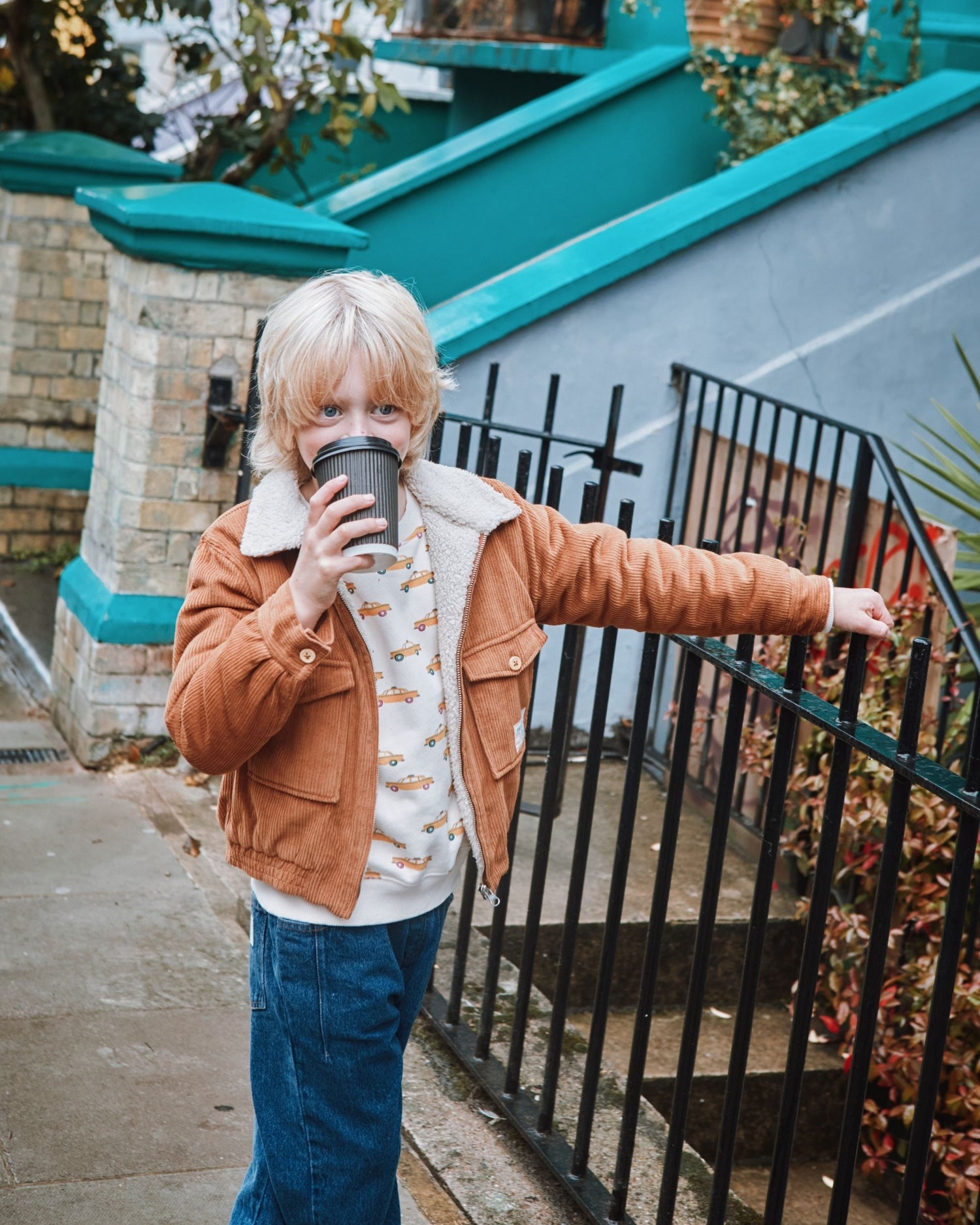 Caramel cotton corduroy jacket lined with ecru faux-fur.