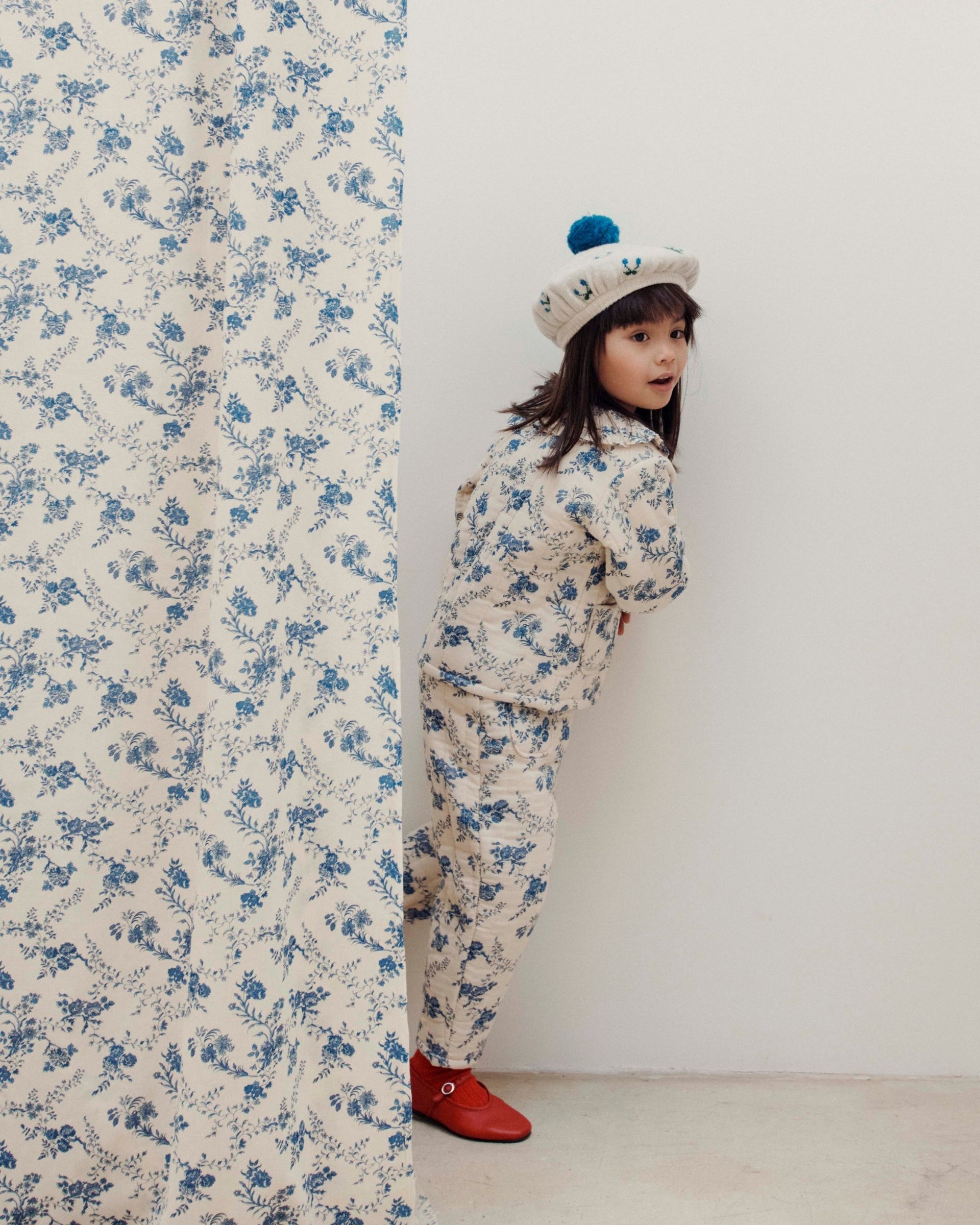 De délicates fleurs bleues s'étendent sur un fond écru.