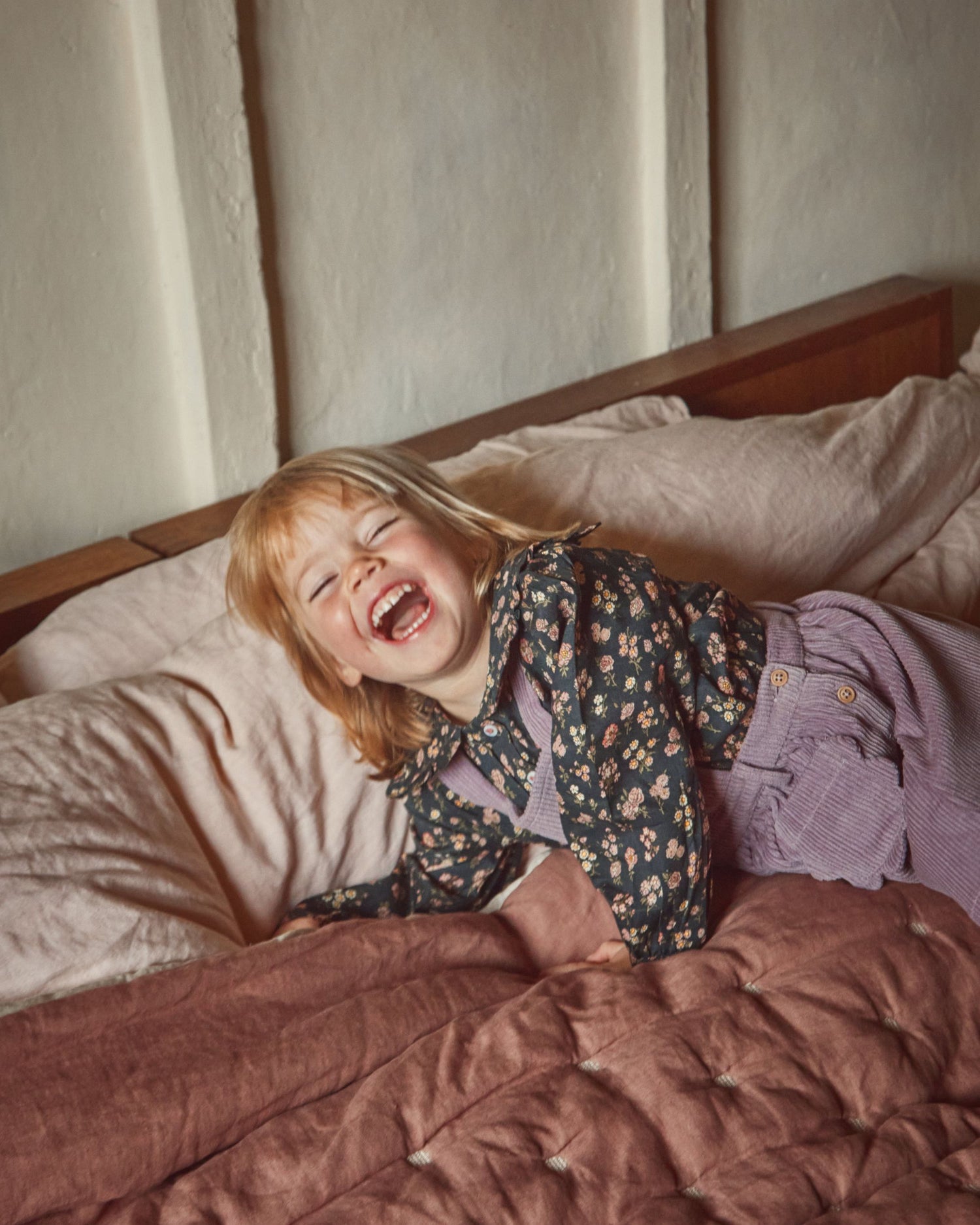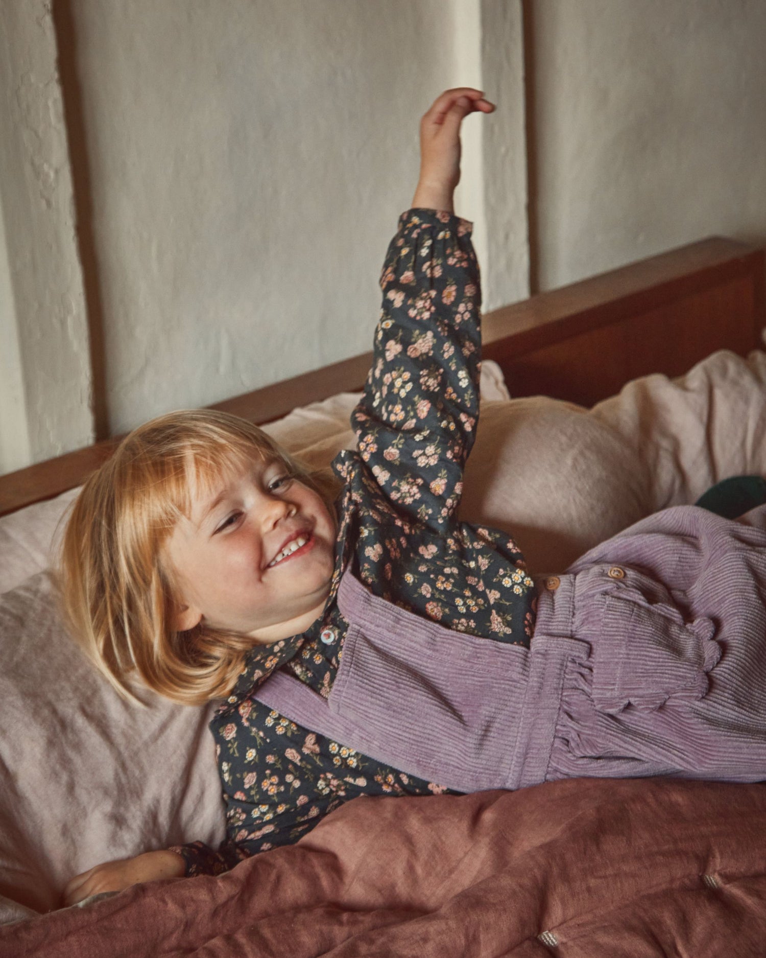Coupe évasée dont l'ampleur est renforcée par les quelques fronces autour de l'encolure, large col inspiré des cols marins et bordé d'un volant, manches longues resserrées aux poignets et bien évidemment boutons en nacre naturelle. Un chemisier chic et confortable qui laisserait croire que les petites filles sont toujours sages.