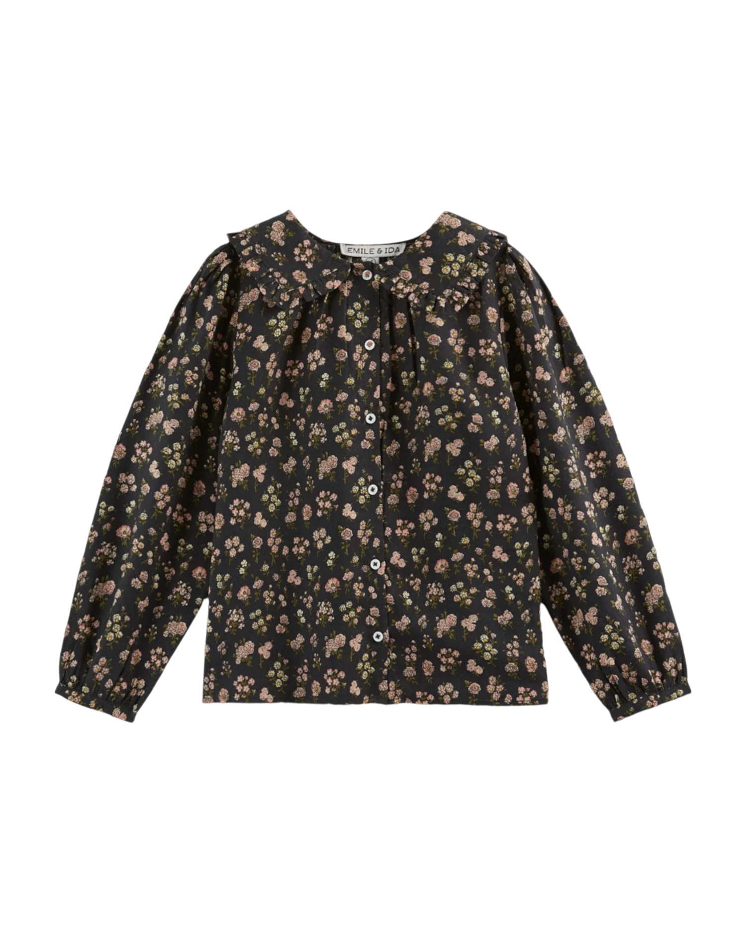 Blouse en coton dont le fond noir est parsemé de fleurs roses et blanches.