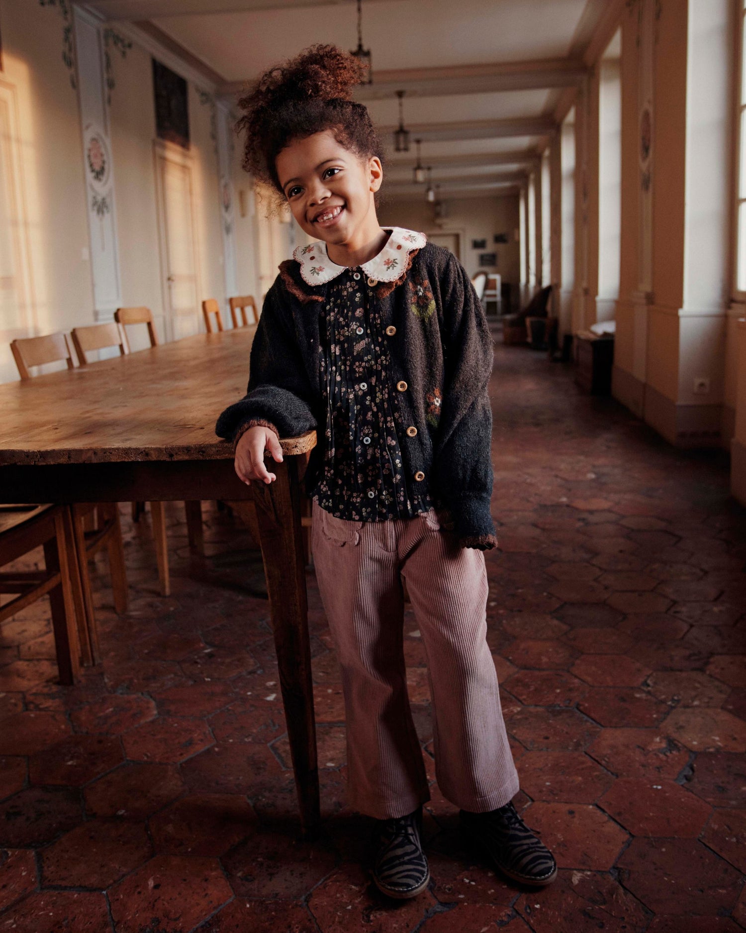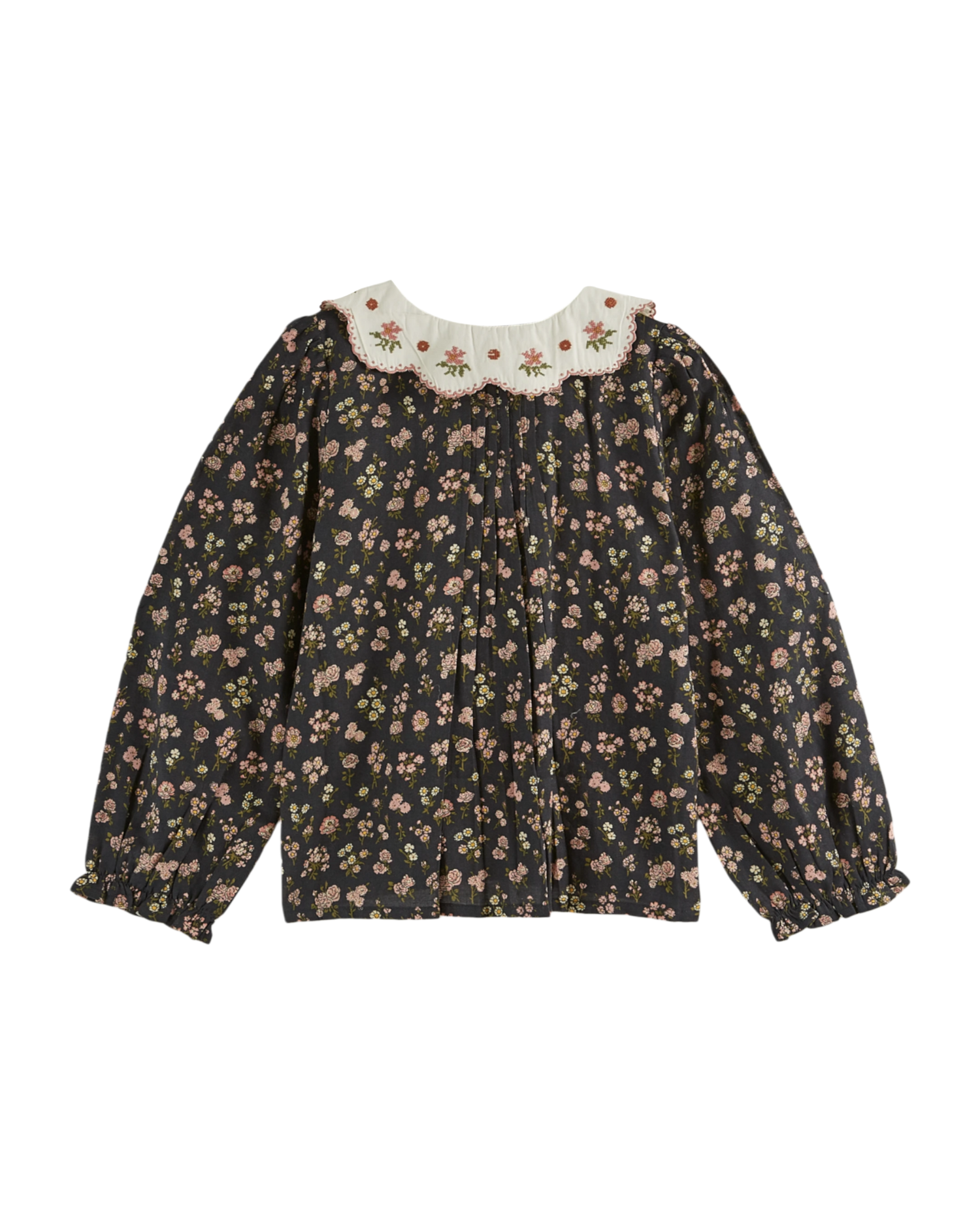 Coupe évasée dont l'ampleur est générée par les plis couchés de chaque côté de la patte de boutonnage et dans le dos. Ils sont cousus jusqu'à mi-hauteur ce qui facilite grandement le repassage. Les manches longues sont resserrées aux poignets par un élastique ce qui produit un effet volanté. Le col recouvre les épaules de ses larges festons soulignés de petits festons brodés au point de bourdon rose. Il est aussi brodé de fleurs au point de croix. Ces broderie sont exécutées à la main par des artisans indiens.