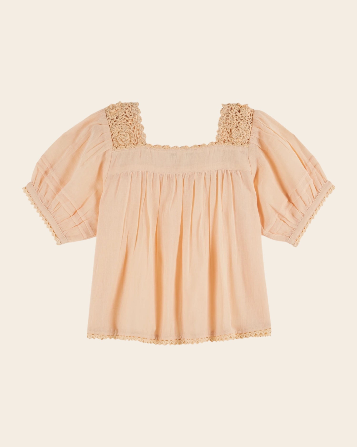Blouse en coton bio abricot. L'originalité réside dans les inserts de dentelle crochetés à la main, dans les jours échelle qui délimitent des inserts de broderie et des bandes de petits plis couchés.