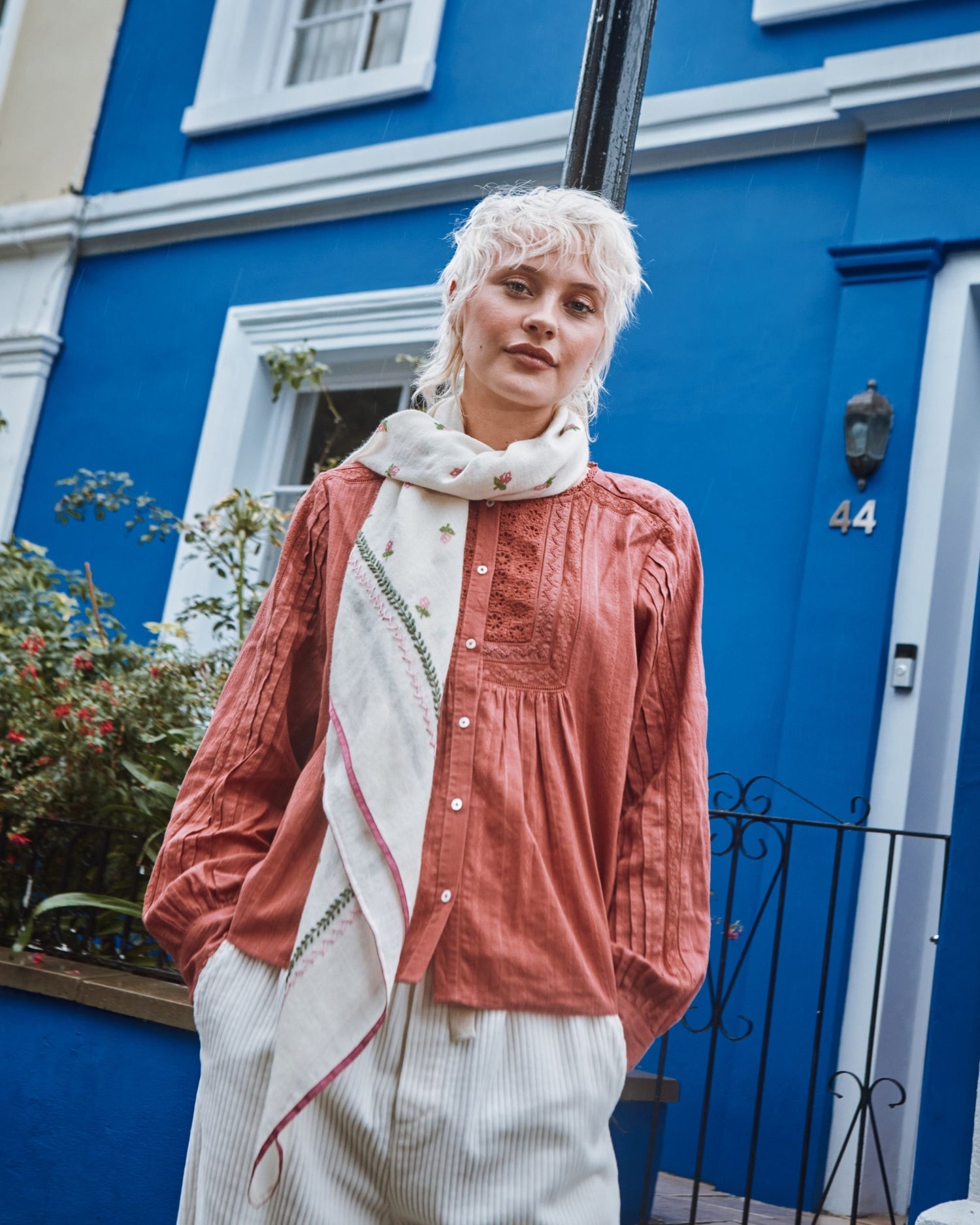 Blouse en coton, d'une douceur incroyable, brique. Une blouse qui tire sa délicatesse des inserts de dentelles et de jours échelle, des plis couchés sur les manches et du galon brodé autour des manchettes et de l'encolure.