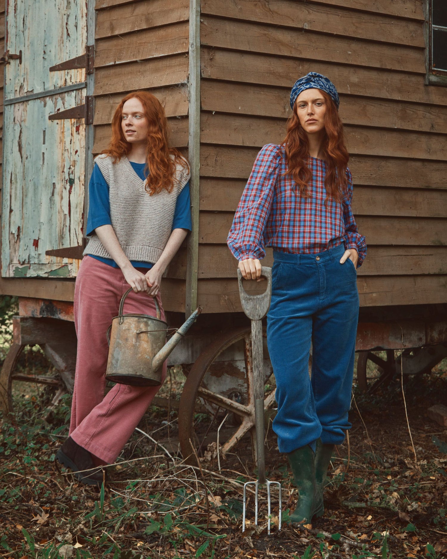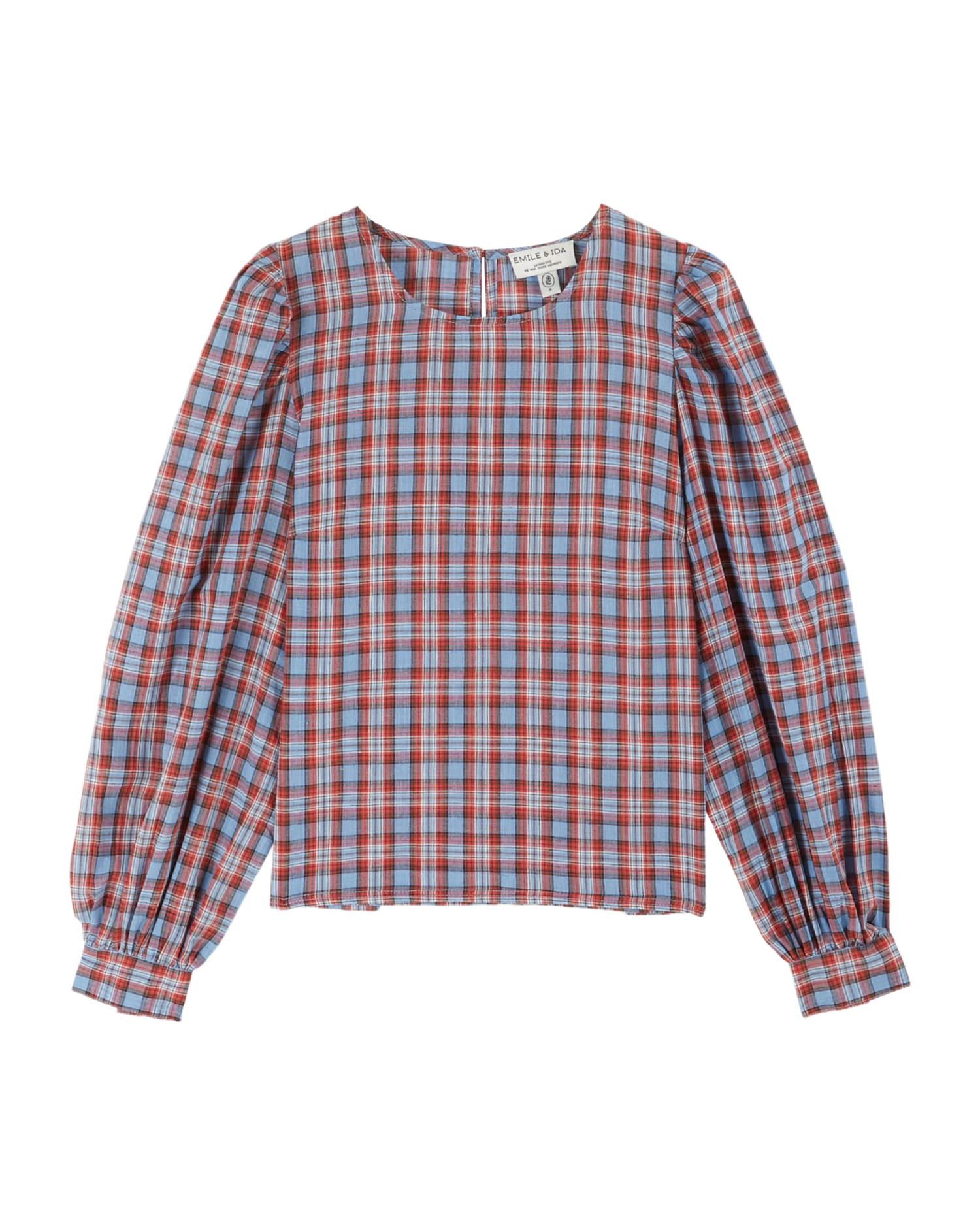 Blouse en coton écossais où le rouge et le bleu s'entrecroisent soulignés de lignes noires. Une blouse à l'encolure ras du cou, aux manches ballonnées resserrées aux poignets par deux boutons et à la coupe légèrement évasée. Pas de patte de boutonnage mais une petite fente dans le dos fermée par un bouton recouvert, comme ceux des poignets, de tissu. Le khadi est un tissu filé et tissé à la main dans les villages indiens. Considéré autrefois comme le tissu des pauvres en raison de ses origines rurales et de sa texture irrégulière et grossière, aujourd'hui le Khadi se diversifie, s’affine, s’assouplit. Sa rareté, l’irrégularité de son tissage, sa beauté artisanale en font un tissu d’exception.