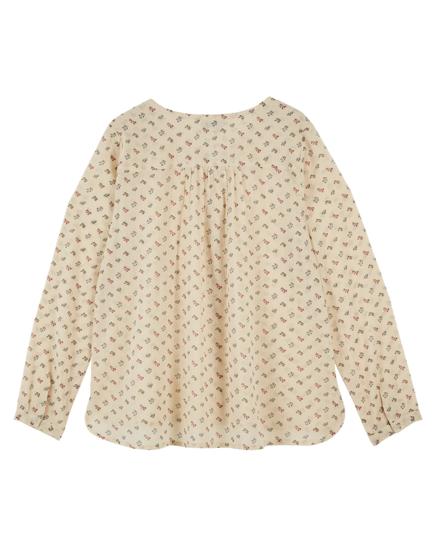 Blouse à manches longues en voile de coton créponné écru sur lequel s'épanouissent des bouquets de fleurettes roses et bleus. La matière souple et légère se pare de l'imprimé "Sorgue", une exclusivité Emile et ida.