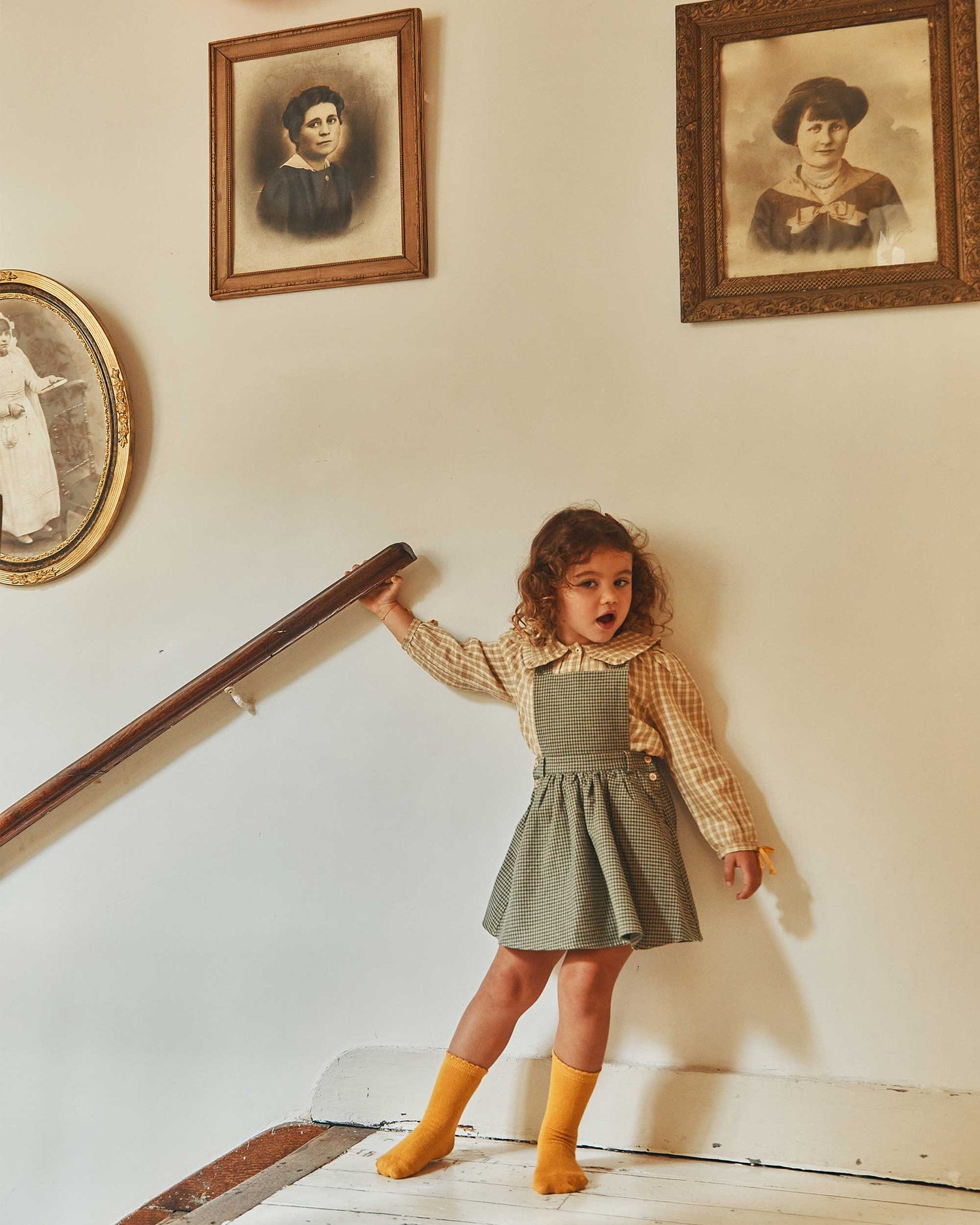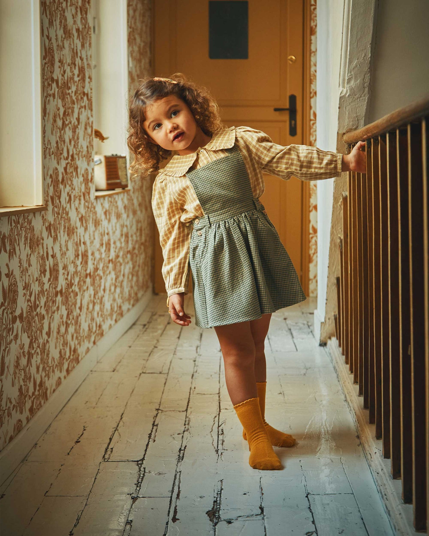 Blouse en flanelle de coton quadrillée beige et écru. Les carreaux sont soulignés de fines lignes orange et jaunes. Coupe évasée dont l'ampleur est renforcée par les quelques fronces autour de l'encolure, large col inspiré des cols marins et bordé d'un volant, manches longues joliment finies aux poignets avec un nœud en sergé de coton jaune et bien évidemment boutons en nacre naturelle. Un chemisier chic et confortable qui laisserait croire que les petites filles sont toujours sages. Enveloppées dans la douceur et la chaleur de la matière vos filles traverseront l'hiver sans subir les assauts du froid.