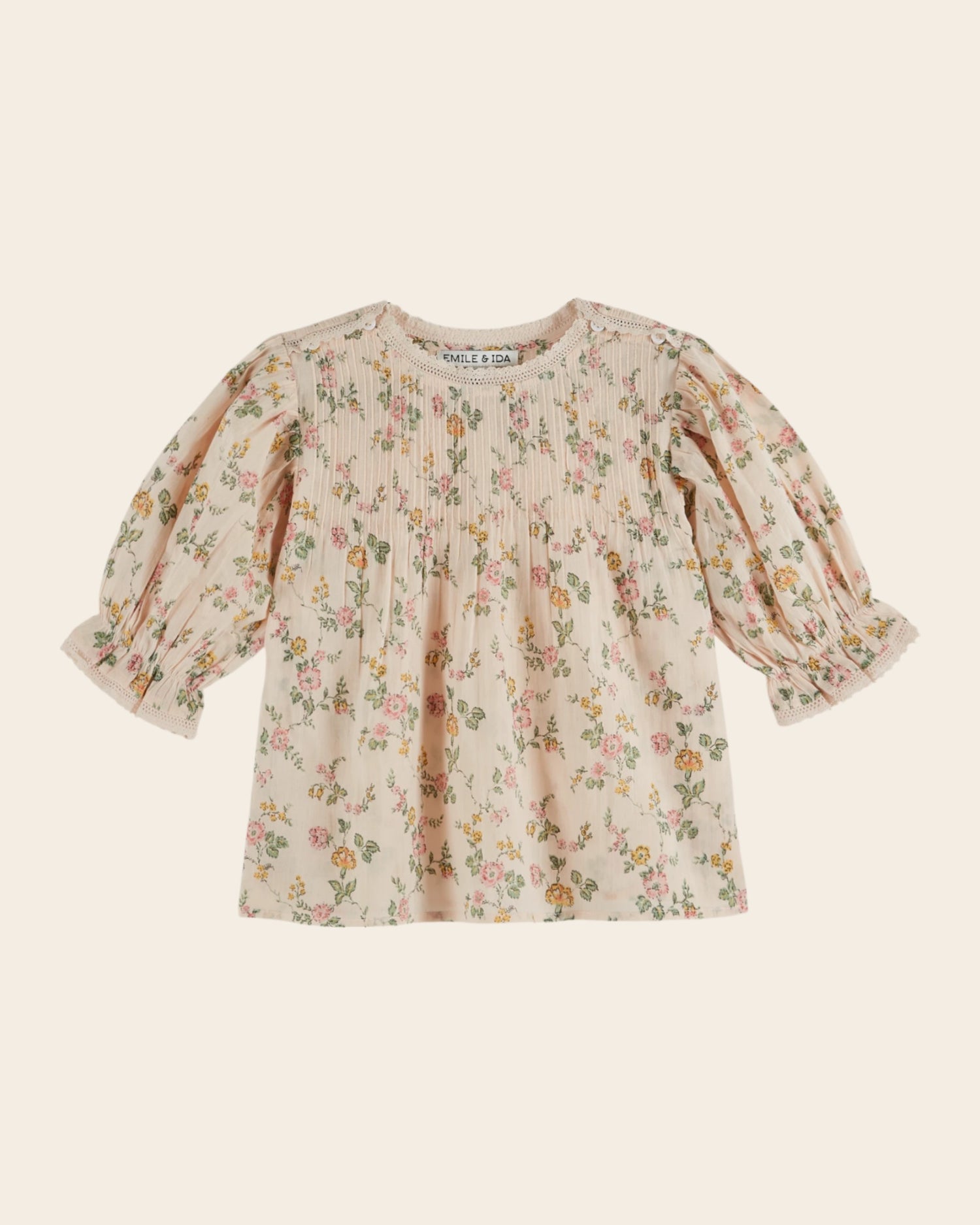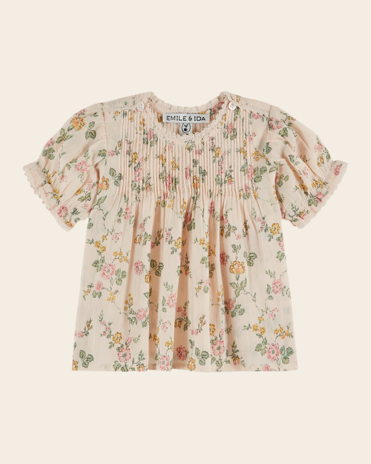 Blouse en voile de coton biologique crème rosé dont l'imprimé de roses et d'oeillets est inspiré d'un motif vintage. Une blouse légère et délicate, parfaite pour toutes les belles journées d'été.