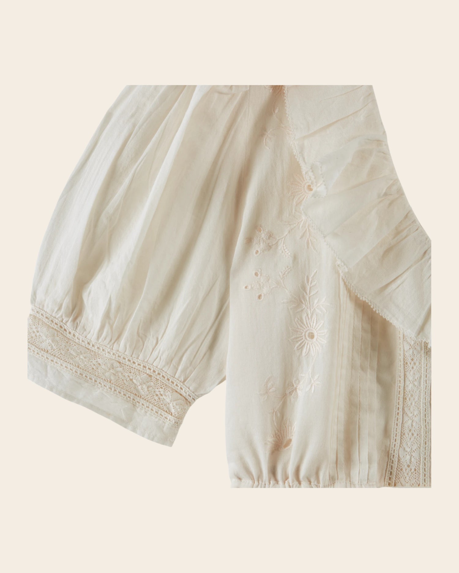 Blouse vintage en voile de coton bio crème au décolleté volanté. De subtiles fleurs brodées et ajourées viennent sublimer l'avant.