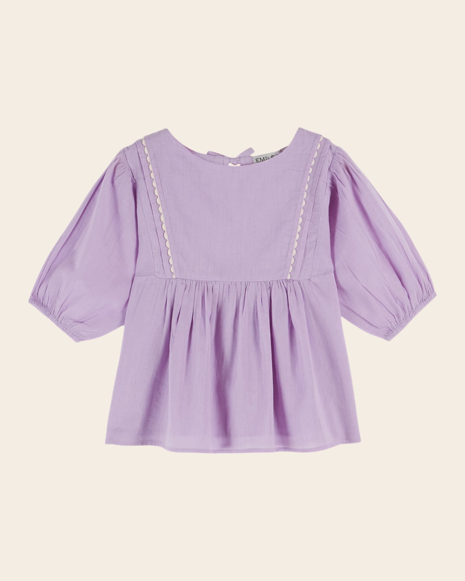 Blouse en voile de coton biologique mauve uni. Le grand empiècement devant et dos se termine sur les côtés par un plis couché et un galon de croquet écru.