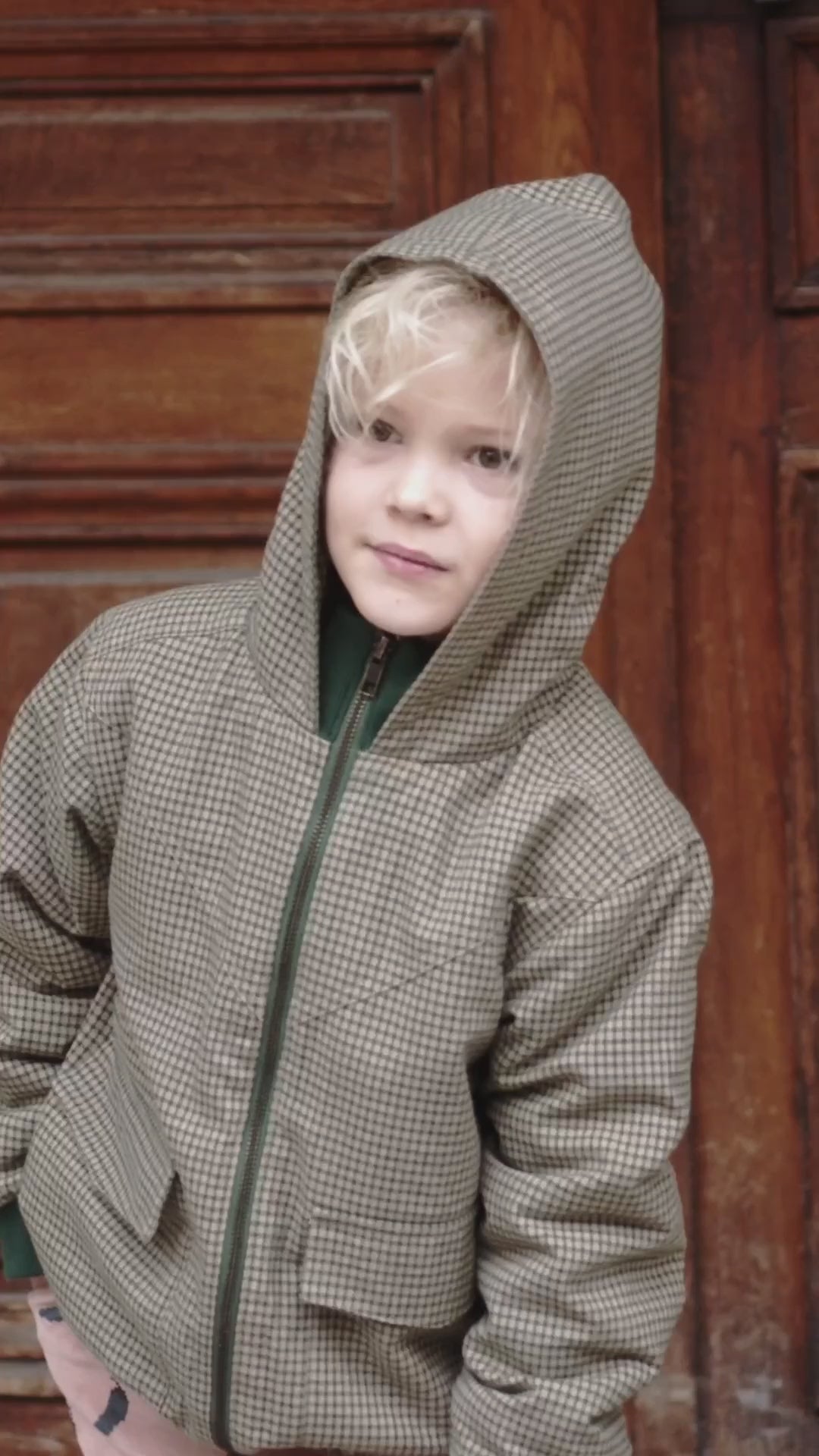 Blouson en toile de coton dont le fond beige est animé de lignes horizontales et verticales vertes. On aime la doublure en fausse fourrure, l'empiècement en V sur le devant, les poches plaquées à rabat. Le bord-côte vert en bas des manches et autour de l'encolure ainsi que la capuche et l'élastique à la base laissent le froid à l'extérieur. On adore la moustache rouge brodée sur une poche, emblème historique de Emile et ida. Une veste aux couleurs automnales pour se fondre dans la nature !