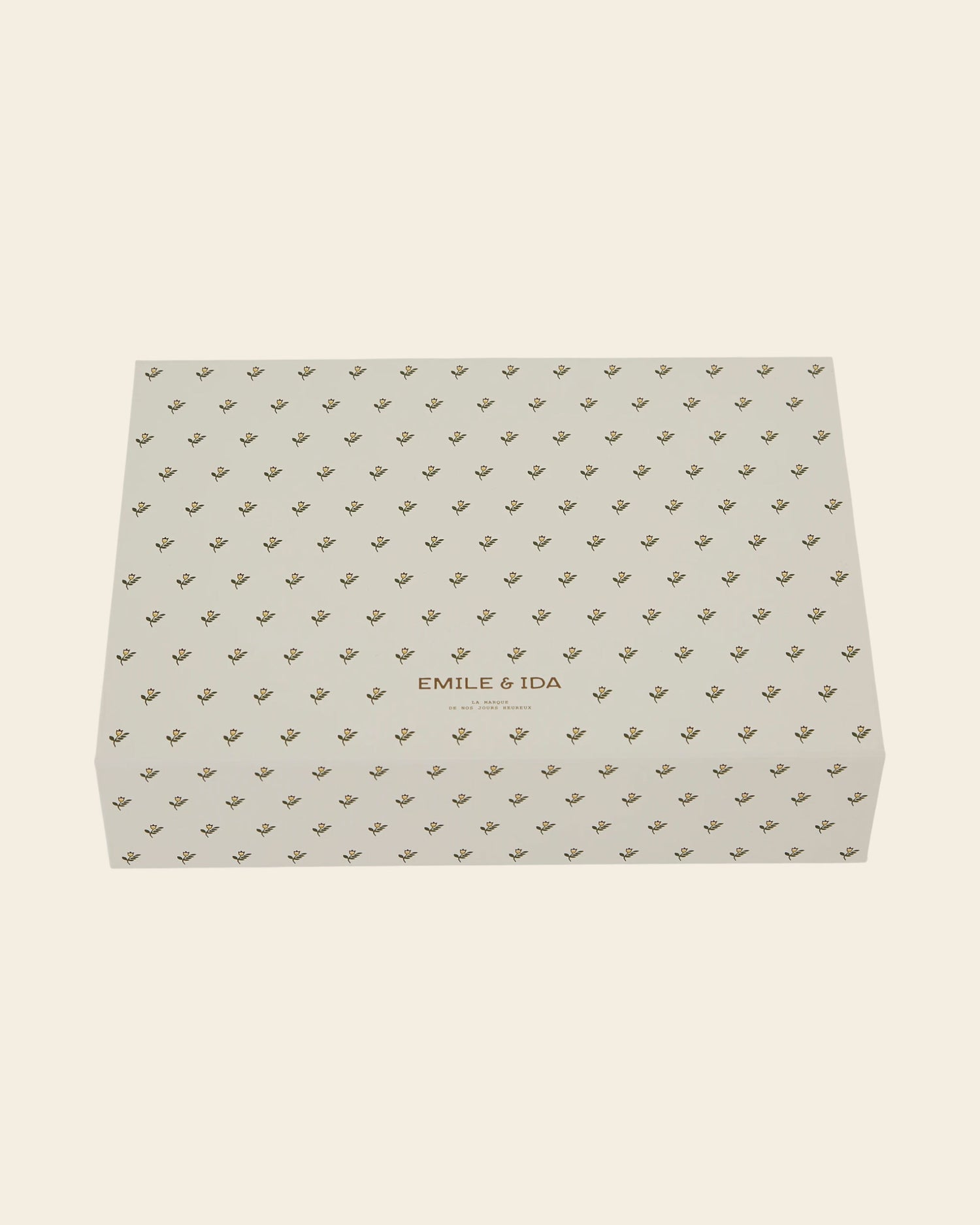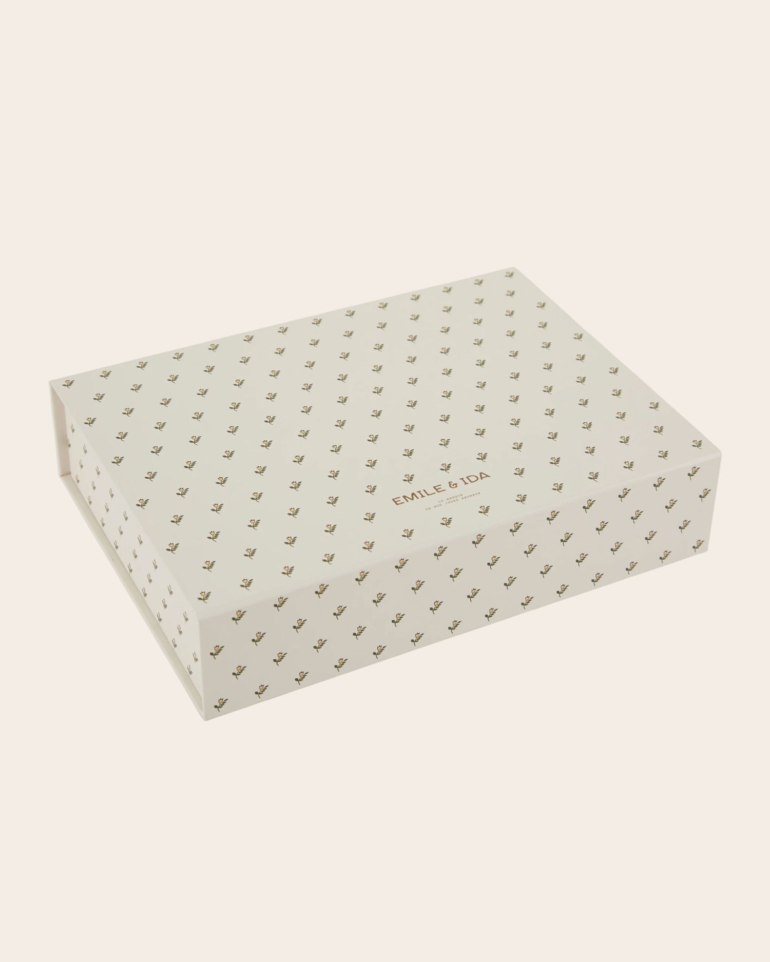 Boîte cadeau rectangulaire écrue parsemée de jonquilles jaunes. Logo Emile et Ida doré imprimé sur le dessus. Ouverture aimanté.
