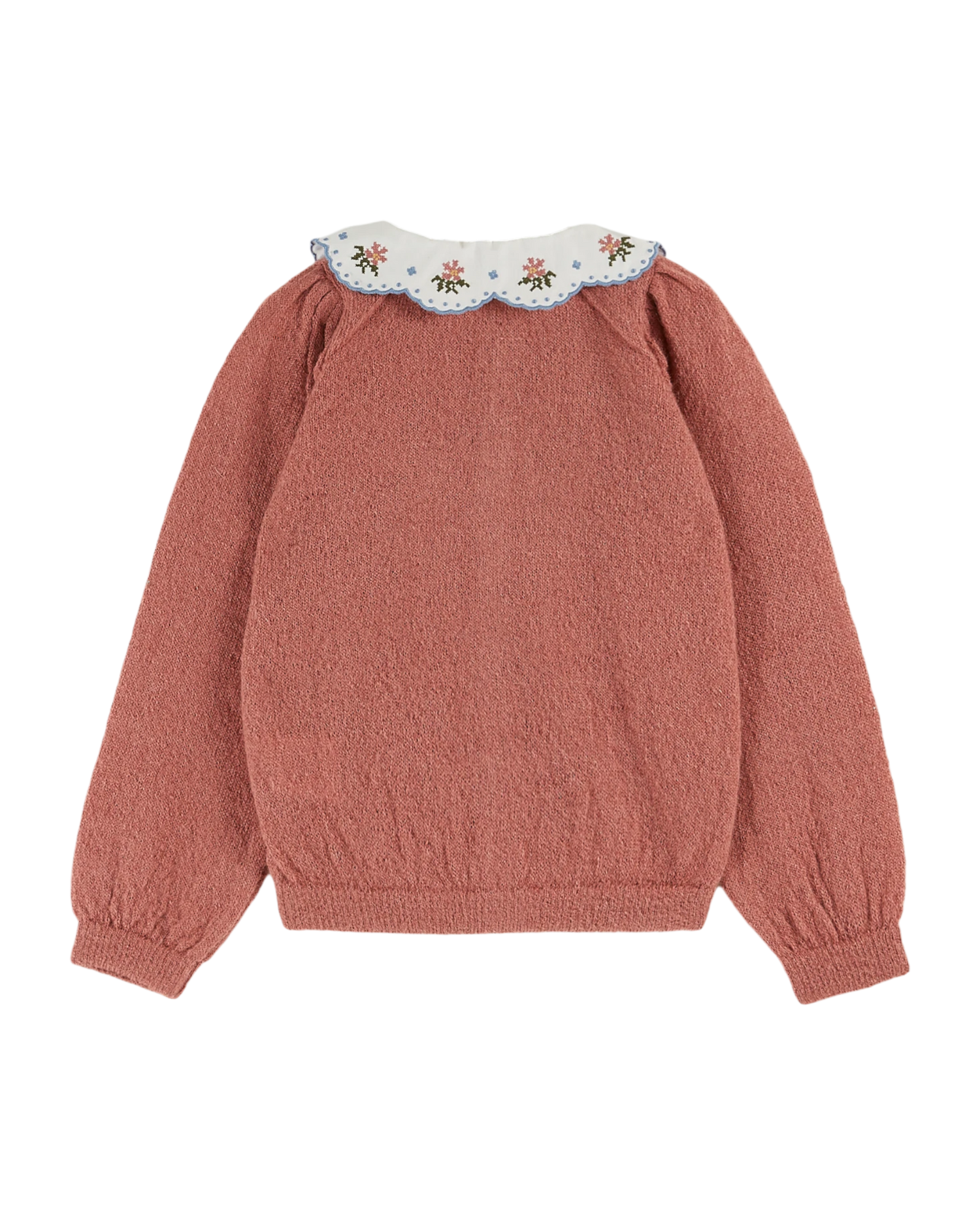 Cardigan en laine mohair mélangée à des fibres synthétiques qui apportent plus de douceur quand la laine, parfois, génère quelques démangeaisons. Elles en renforcent aussi la solidité et offrent ainsi une plus longue vie à la pièce. Fin, léger et douillet, tricoté au point de jersey il est rose uni. L'encolure ronde est bordée par un col blanc en coton. Il est festonné, brodé de fleurs au point de croix par des artisans indiens et ourlé au point de bourdon. Un col tout en délicatesse qui donne toute la singularité au cardigan. Les manches raglan, pour ne gêner aucune de vos filles aux entournures et la base du cardigan sont terminées par des côtes dans lesquelles des fils élastiques sont passés afin d'éviter qu'elles ne se détendent trop vite. Des boutons en bois ferment la patte de boutonnage doublée par une bande de jersey. Des journées froides de l'hiver aux soirées fraîches de l'été voilà un cardigan qui s'accommode à toutes les saisons.