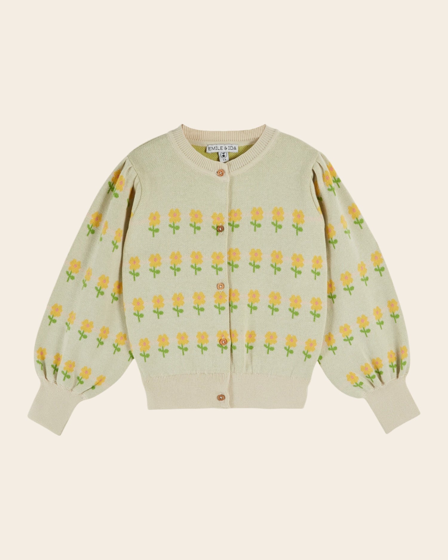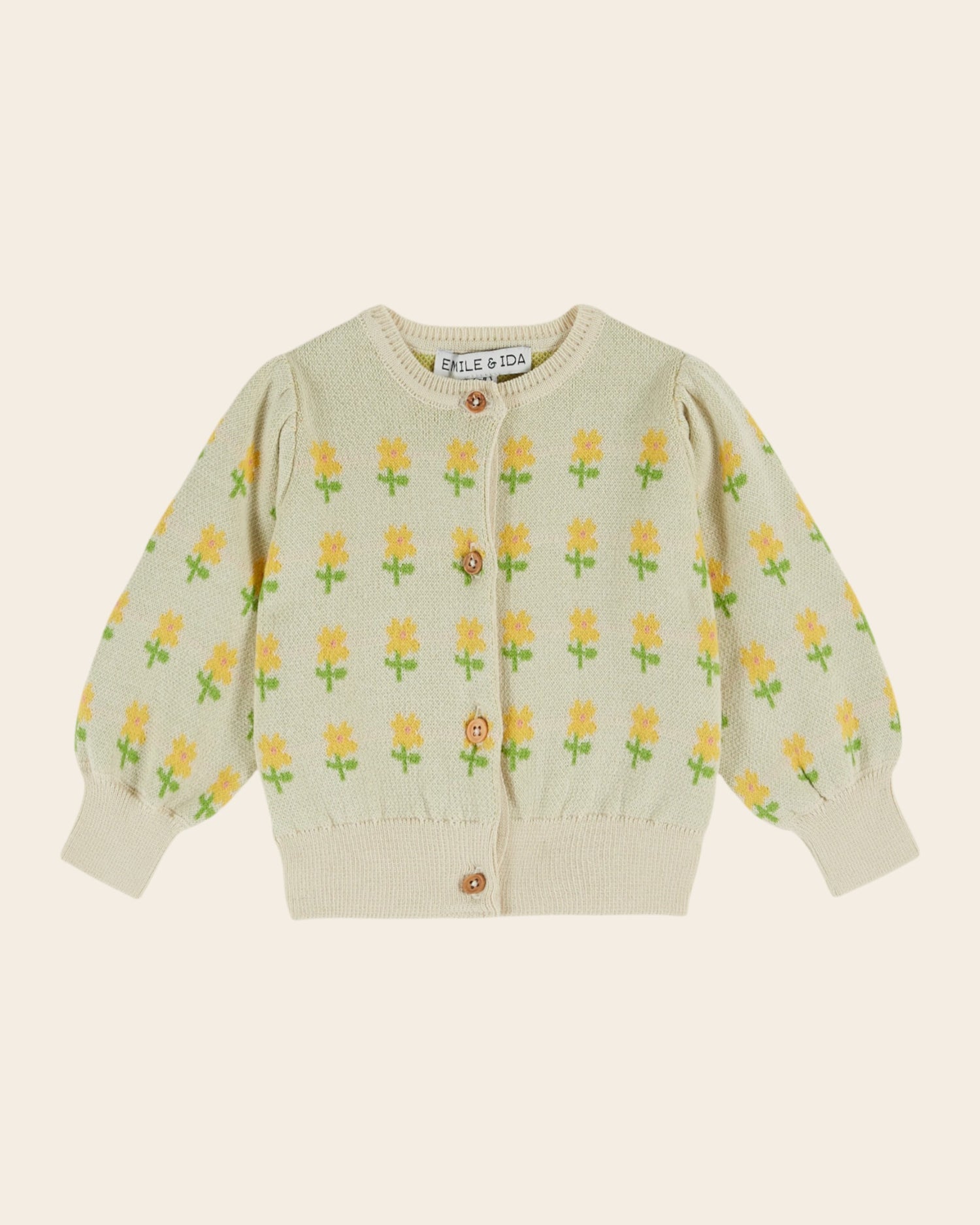Cardigan en jersey de coton biologique beige clair sur lequel ont mûri quatre lignes de fleurs devant, derrière et sur les manches.