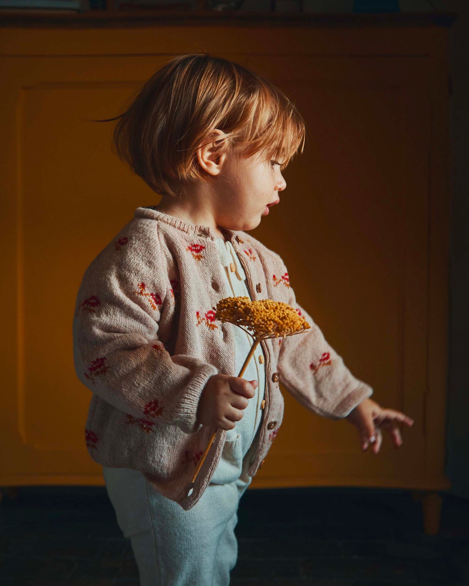 Cardigan jacquard en laine d'alpaga mélangée beige parsemé de roses en all-over. Ainsi ce cardigan douillet, léger ne se déformera ni ne se froissera grâce à l'apport des fibres synthétiques et en prime il résistera aux assauts de la cour de récré. Le jacquard intarsia, technique de tricotage employée pour dessiner les roses et leurs tiges, rend le pull deux fois plus chaud voire deux fois plus moelleux. Grâce aux côtes 1X1 aux poignets, à la base et autour de l'encolure ras du cou, le froid ne s'immisce pas dans les larges manches raglan, ni près du corps. Un pull plein de poésie pour les jardinières en herbe ! Existe en bébé.