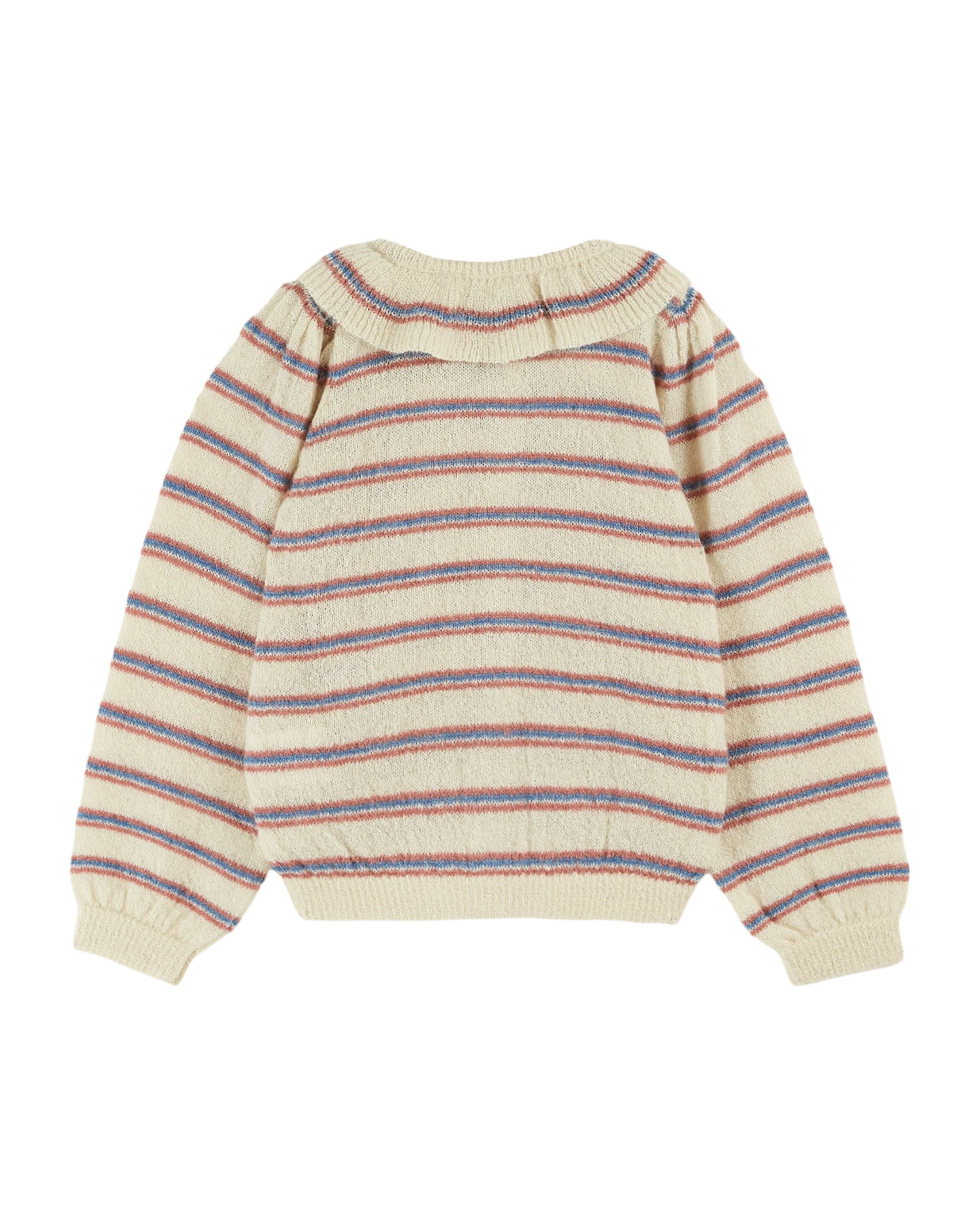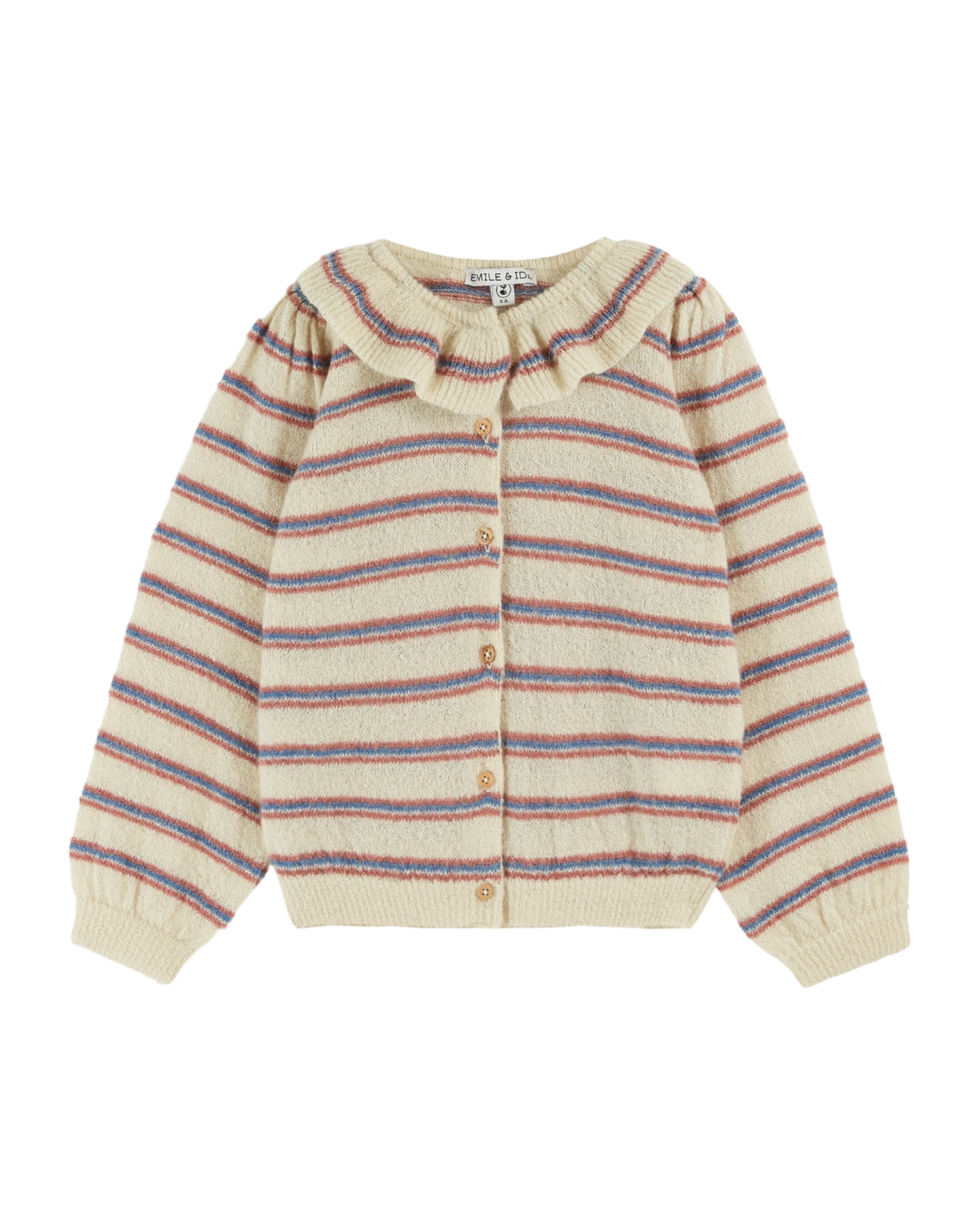 Fin, léger et douillet, tricoté au point de jersey, le cardigan écru est rayé régulièrement de lignes vieux rose et bleues.