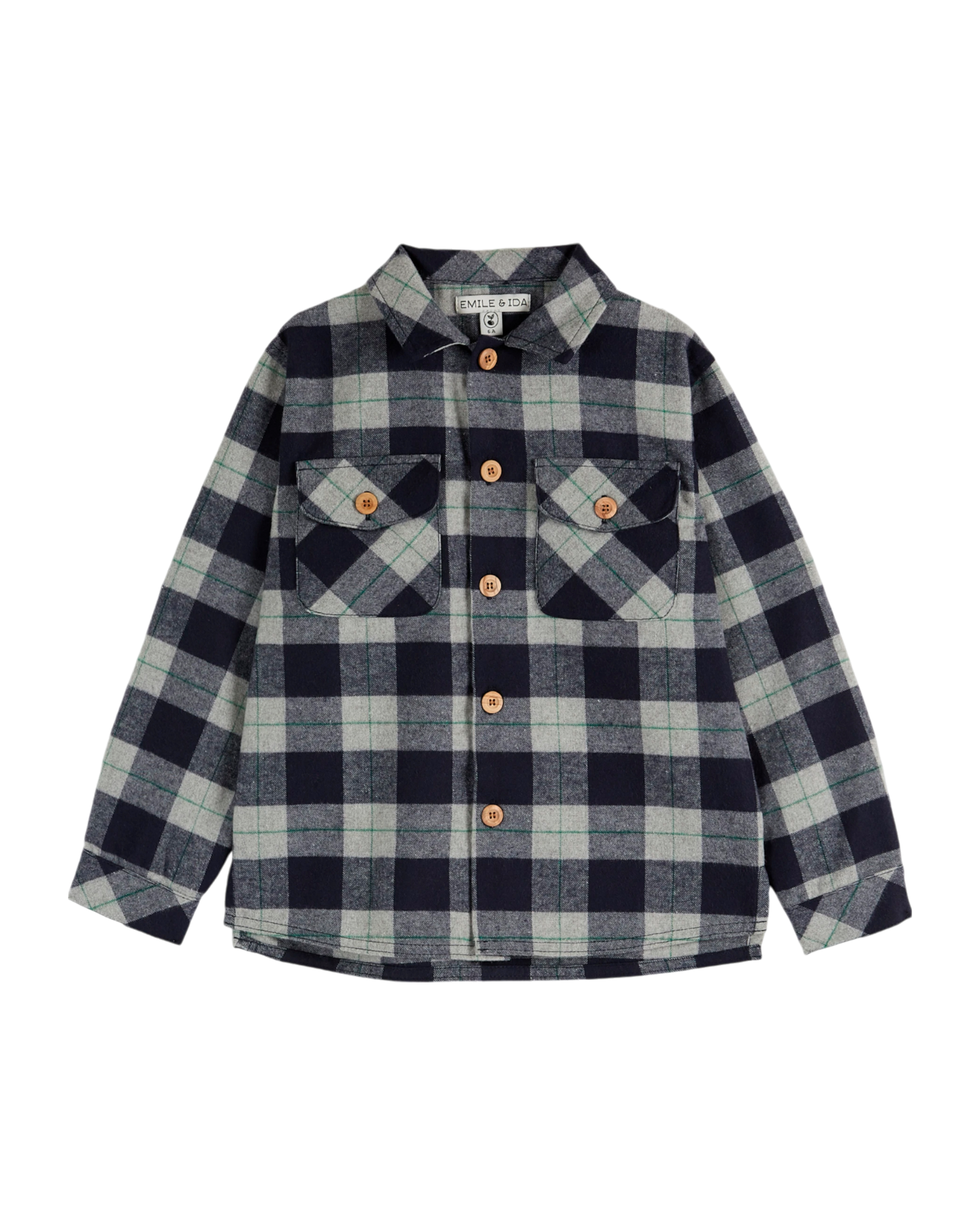 Surchemise en flanelle de coton à gros carreaux bleu et bleu marine. Inspirée des vêtements des bûcherons, cette surchemise, duveteuse et souple grâce au processus de grattage, fournit la chaleur dont vos enfants ont besoin en hiver. Le coton gratté, pas trop épais, est idéal pour pouvoir la porter à la fois sur un tee shirt ou à même la peau, quelle que soit la saison.
