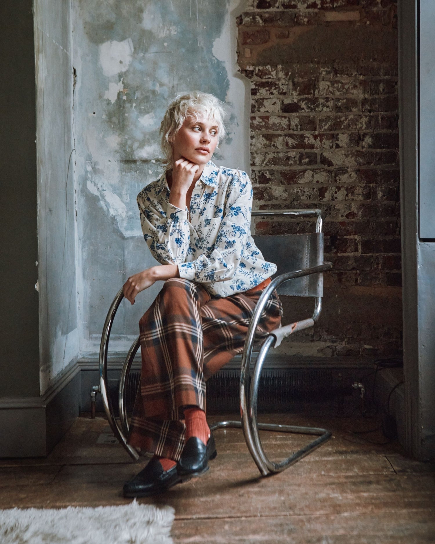 Chemise en coton écru ornée de fleurs bleues sur fond écru. La coupe over-size s'inspire des chemises d'homme.