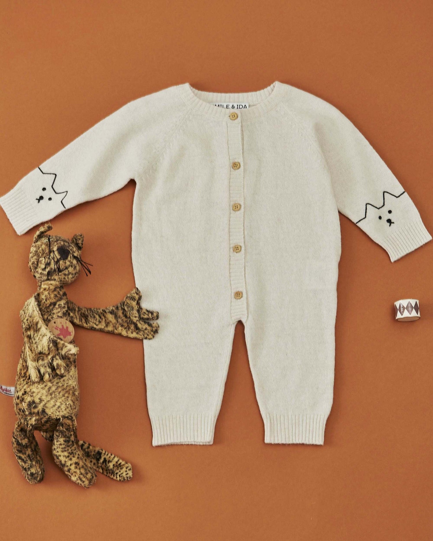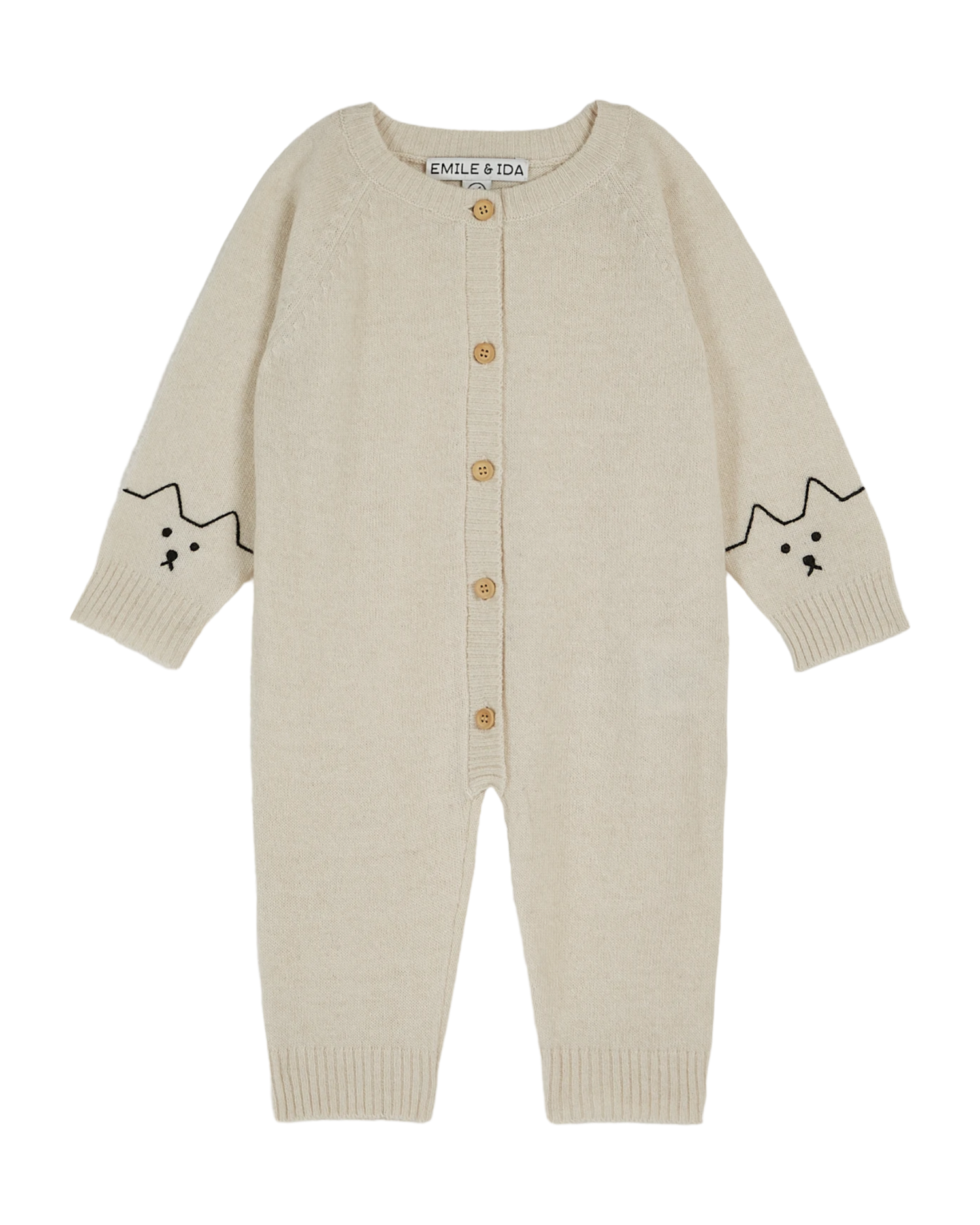 La qualité des matériaux employés sublime le modèle tricoté au point de jersey. Emmanchures raglan, bouton en bois sur toute la hauteur et deux manches longues brodées sur les poignets d'un museau de chaton noir. Des côtes resserrent les poignets et les chevilles. Autour de l'encolure, le bande de côtes rapportée est en double épaisseur.