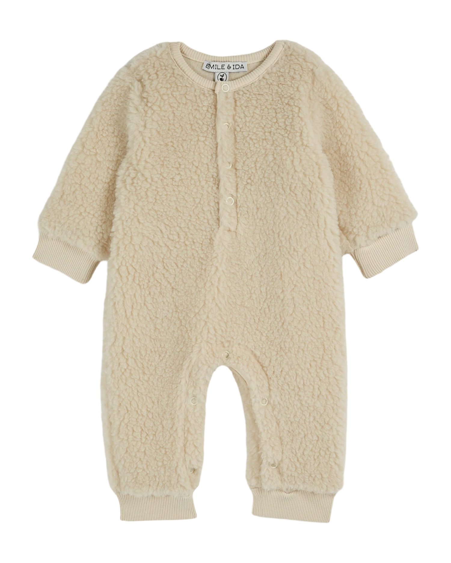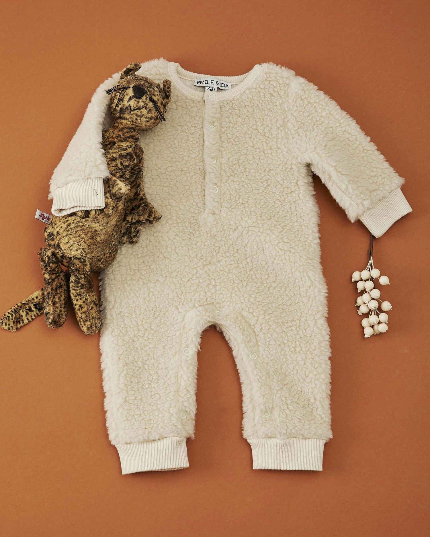 Combinaison en peluche de coton et fibres synthétiques écru. Si vous voulez transformer votre bébé en doudou tout doux nous avons ce qu'il vous faut. Une combinaison dont les poignets, les chevilles et l'encolure ras du cou sont terminés par un bord côte ton sur ton. Une ouverture sur la poitrine facilite le passage de tête sans risque d'y laisser ses oreilles et les pressions tout le long des jambes transforme le change en jeu d'enfant. La douceur, la chaleur et le confort de cette pièce aideront certainement les bébés à rester de bonne humeur !