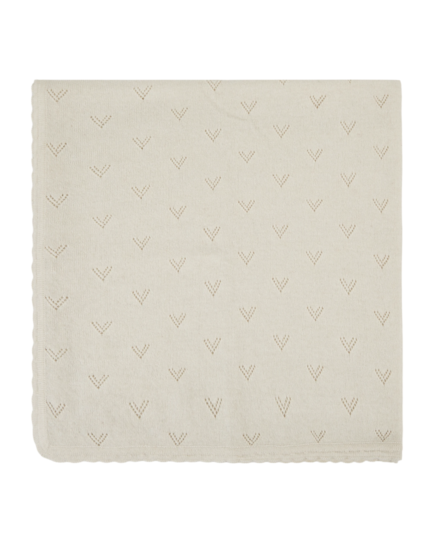 Couverture écrue tricotée au point de jersey en laine cachemire et mérinos mélangés à des fibres synthétiques. Très fine et toute douce, voilà un accessoire joliment bordé sur le pourtour par un feston rapporté. Une couverture qui garde les bébés emmaillotés bien au chaud même quand la température est un peu fraîche dans la maison ou dehors.