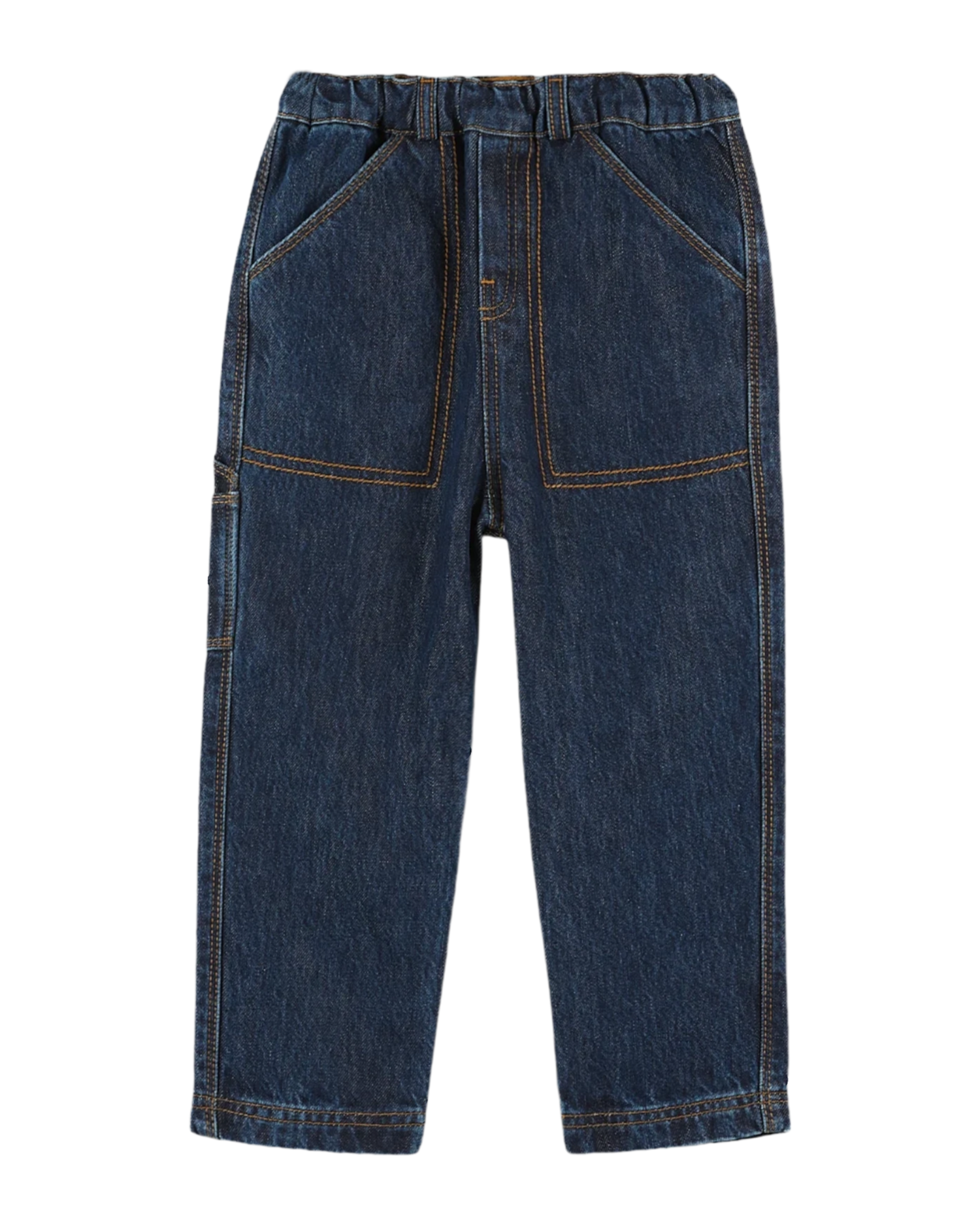 Pantalon en toile de coton denim bleu. La forme, toute en facilité pour les petits garçons, sans bouton ni braguette, s'adapte à toutes les morphologies, des plus menues aux plus dodues grâce à la ceinture à passants élastiquée. Un pantalon qui rendra les collectionneurs de bonbons ou de cailloux heureux au regard des nombreuses poches dont il est doté. Poches italiennes, poches plaquées sur chacune des fesses et poches à outils sur un côté. Tous les assemblages, surpiqués en orange, reprennent les codes du jean. Avec ce pantalon nous souhaitons de belles journées à vos garçons !