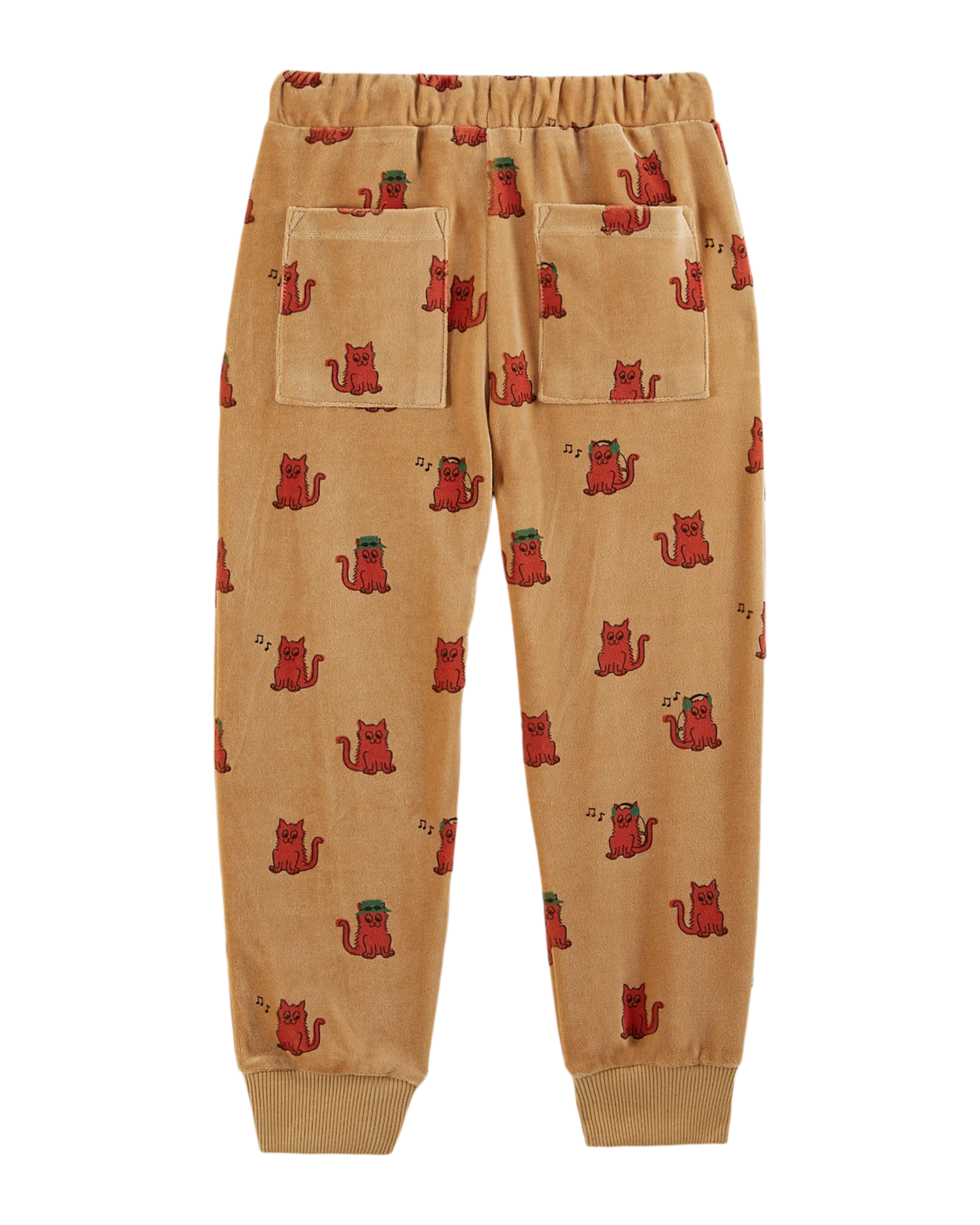 Pantalon de jogging en velours beige sur lequel des matous orange écoutent de la musique, bronzent derrière leurs lunettes de soleil ou réfléchissent. Il est monté sur une large ceinture élastiquée qui ne coupe ni la taille ni la respiration, encore moins la digestion et s'adapte avec un ruban en sergé de coton coulissant dans la ceinture à toutes les morphologies, de la plus dodue à la plus menue. Sur le devant il a deux poches italiennes pour mettre ses mains au chaud et deux poches se sont fait plaquer sur chacune des fesses. Finies les pinces à vélo car les jambes sont resserrées aux chevilles par une bande de bord-côte ton sur ton. Ainsi le bas du pantalon ne se prendra jamais dans le pédalier de la bicyclette.