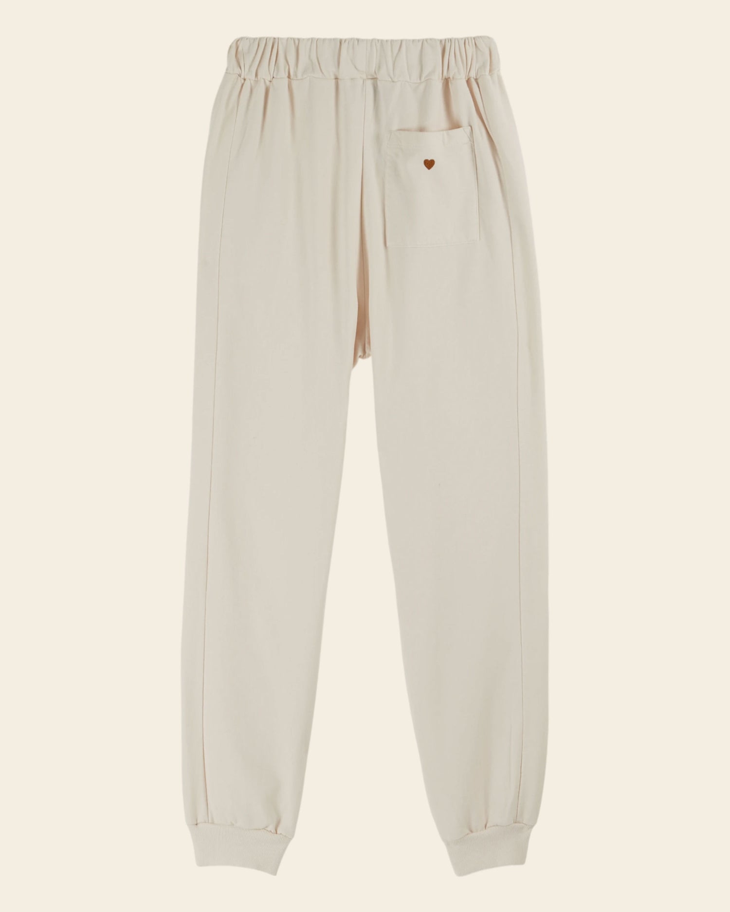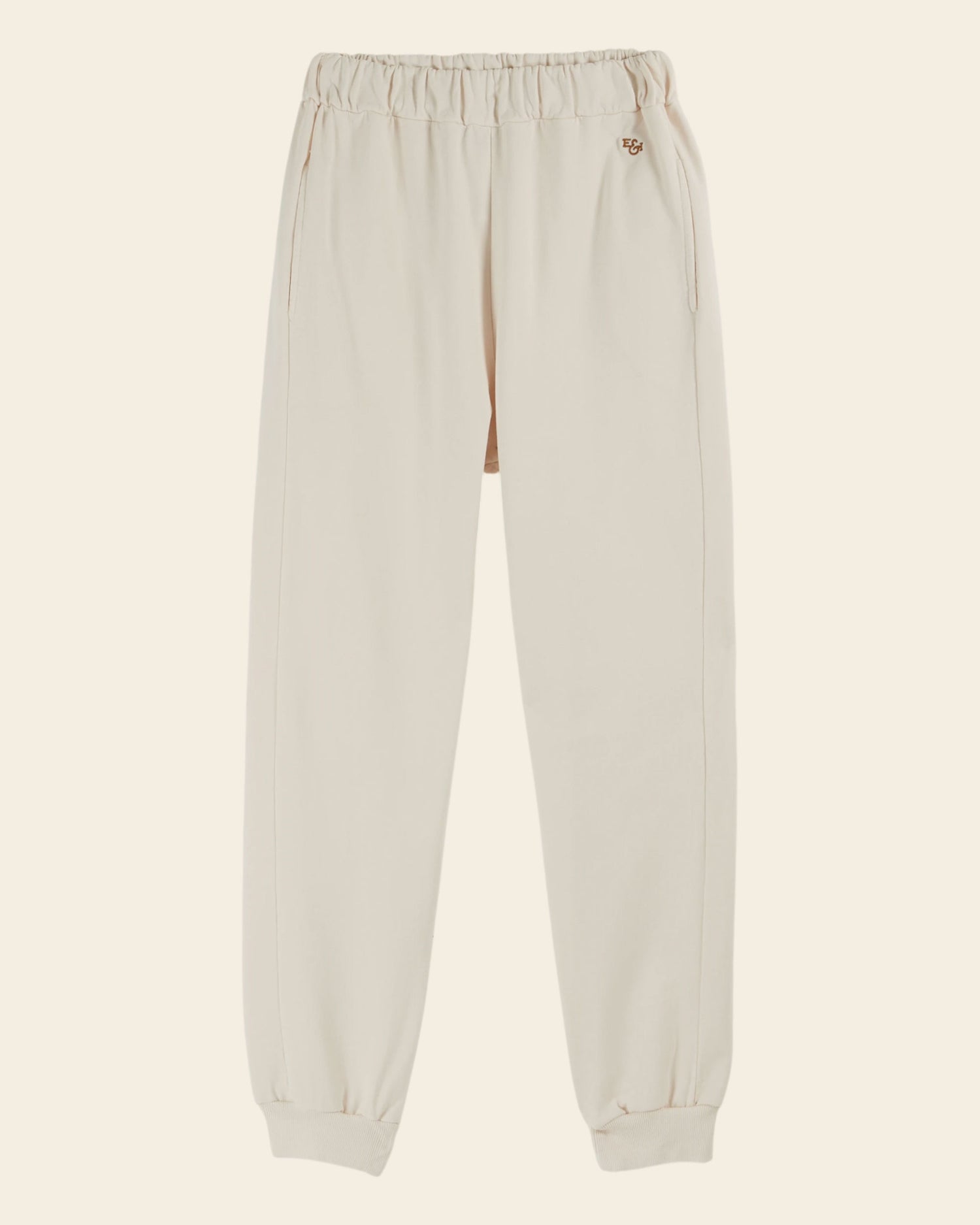 Pantalon de jogging en jersey de coton biologique molletonné et gratté écru. - Large ceinture élastiquée - Matière d'une grande douceur - Finition en bord côte sur le bas du jogger - 2 poches italiennes - 1 poche plaqué avec un coeur brodé marron - Monogramme E&I marron