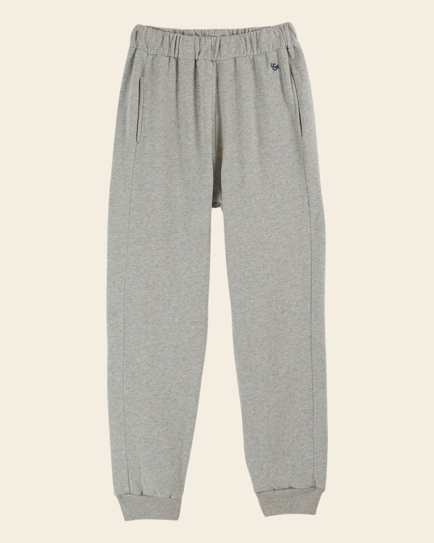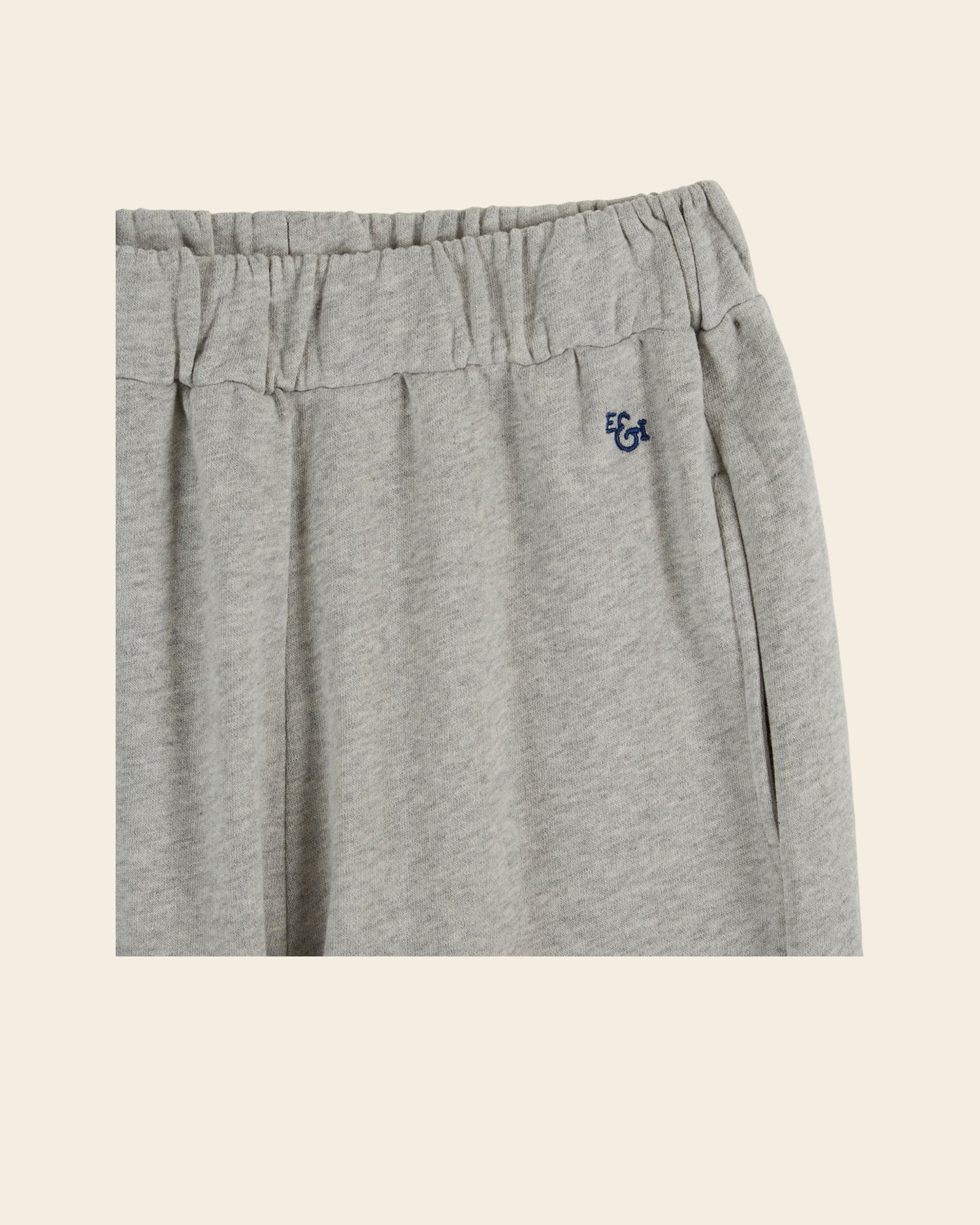 Pantalon de jogging en jersey de coton biologique molletonné et gratté gris chiné. - Large ceinture élastiquée - Matière d'une grande douceur - Finition en bord côte sur le bas du jogger - 2 poches italiennes - 1 poche plaqué avec un coeur brodé marine - Monogramme E&I bleu marine