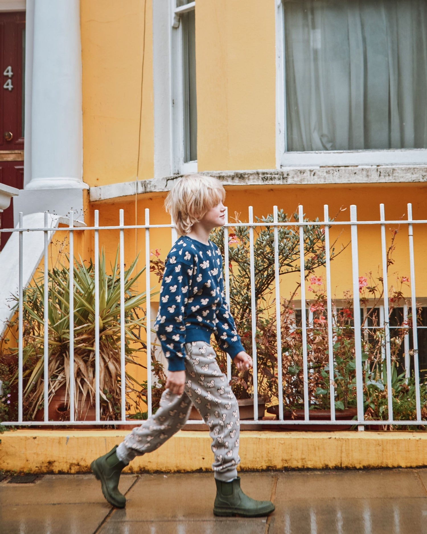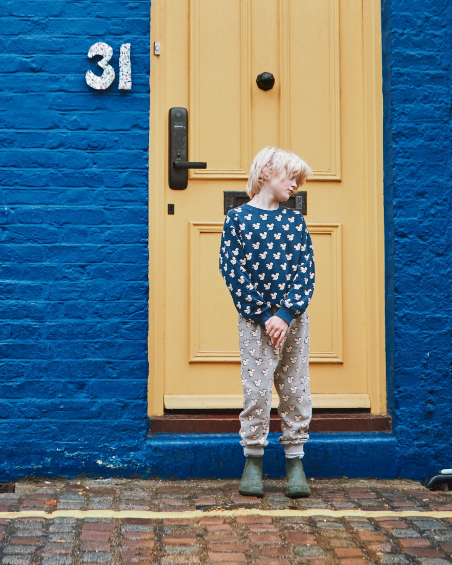 Jogger en jersey de coton biologique gris imprimé d'écureuils crème en all-over. Le coton est molletonné et gratté pour plus de douceur et de chaleur.