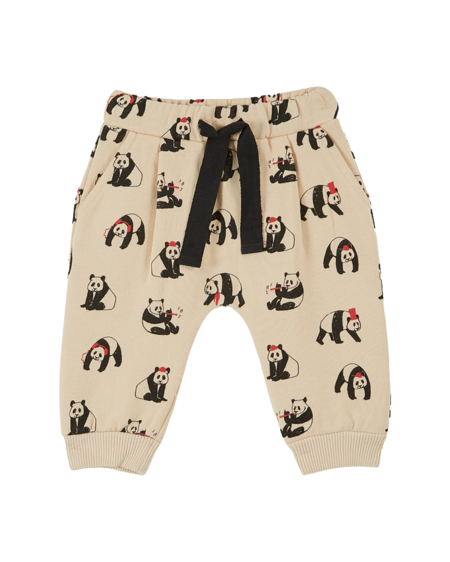 Pantalon de jogging en coton biologique molletonné et gratté beige sur lequel s'amusent des pandas facétieux. Sportif accompli ou sportive du dimanche, supporter dans les gradins ou devant la télé, ce pantalon est fait pour tous ceux et celles qui aiment rester au chaud, sur le terrain ou à la maison. Il est monté sur une large ceinture élastiquée qui ne coupe ni la taille ni la respiration, encore moins la digestion et s'adapte, avec un ruban en sergé de coton coulissant dans la ceinture, à toutes les morphologies, de la plus dodue à la plus menue. Sur le devant il a deux poches italiennes pour mettre ses mains au chaud et deux poches se sont fait plaquer sur chacune des fesses. Finies les pinces à vélo car les jambes sont resserrées aux chevilles par une bande de bord-côte ton sur ton. Ainsi le bas du pantalon ne se prendra jamais dans le pédalier de la bicyclette.