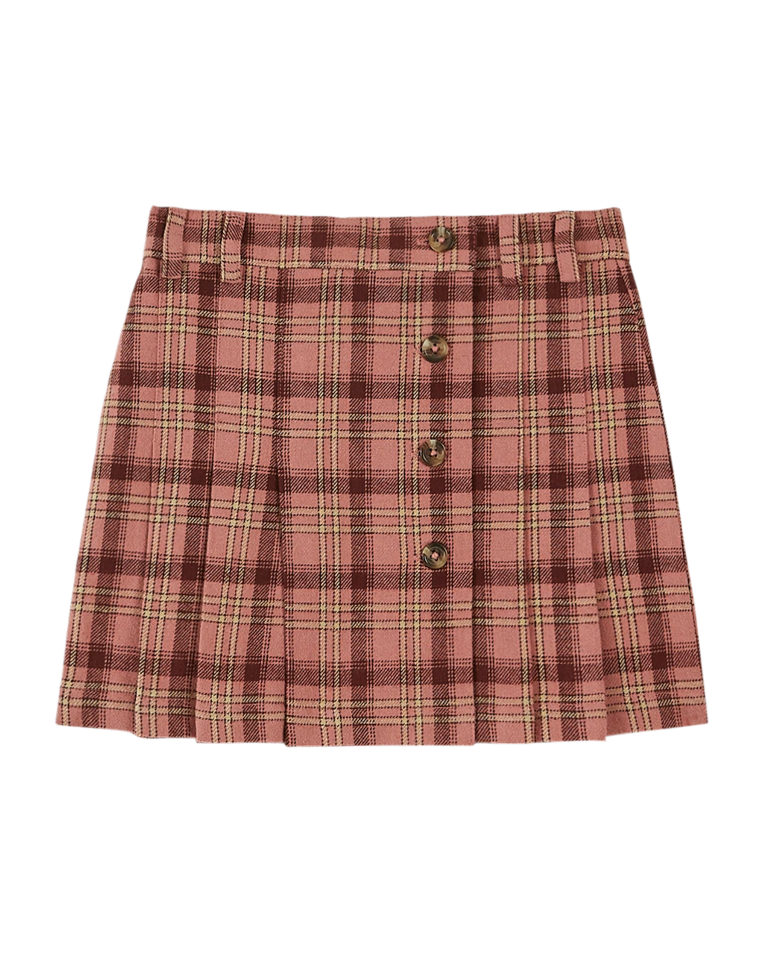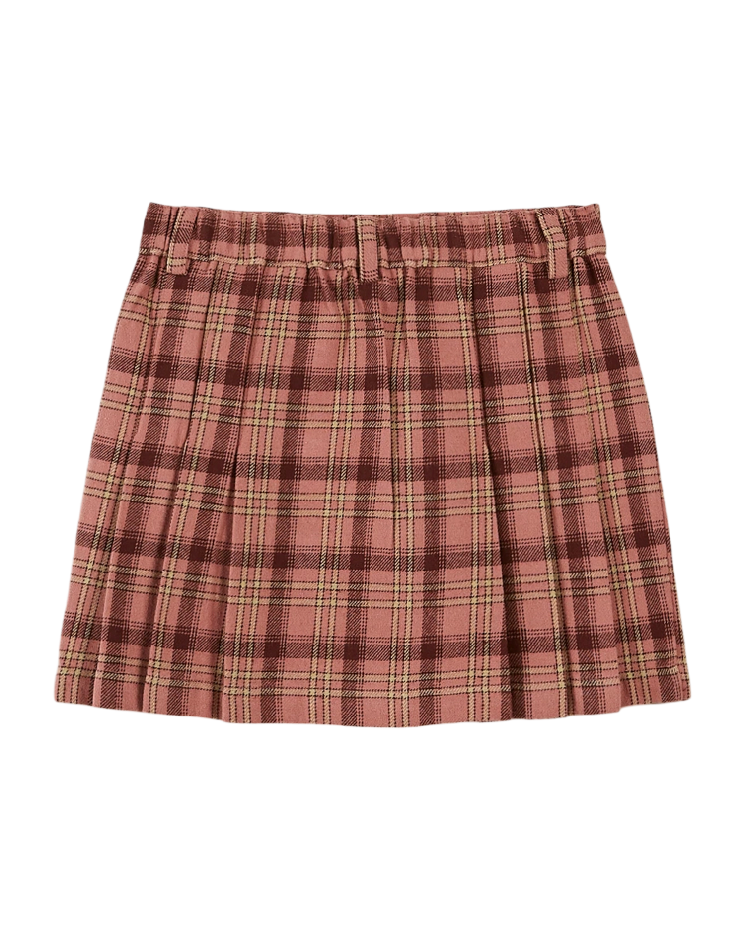 Jupe plissé en coton rose quadrillé de lignes écrues et lie-de-vin.