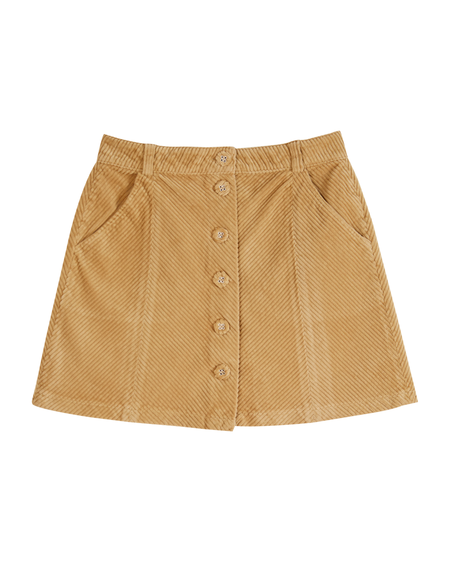 Jupe courte en velours de coton côtelé beige. On aime tout : le velours à grosses côtes, la forme évasée à panneaux, les poches italiennes, la jupe montée sur une ceinture à passants. On adore le jeu graphique des côtes formant chevrons et les boutons recouverts de tissu assorti.