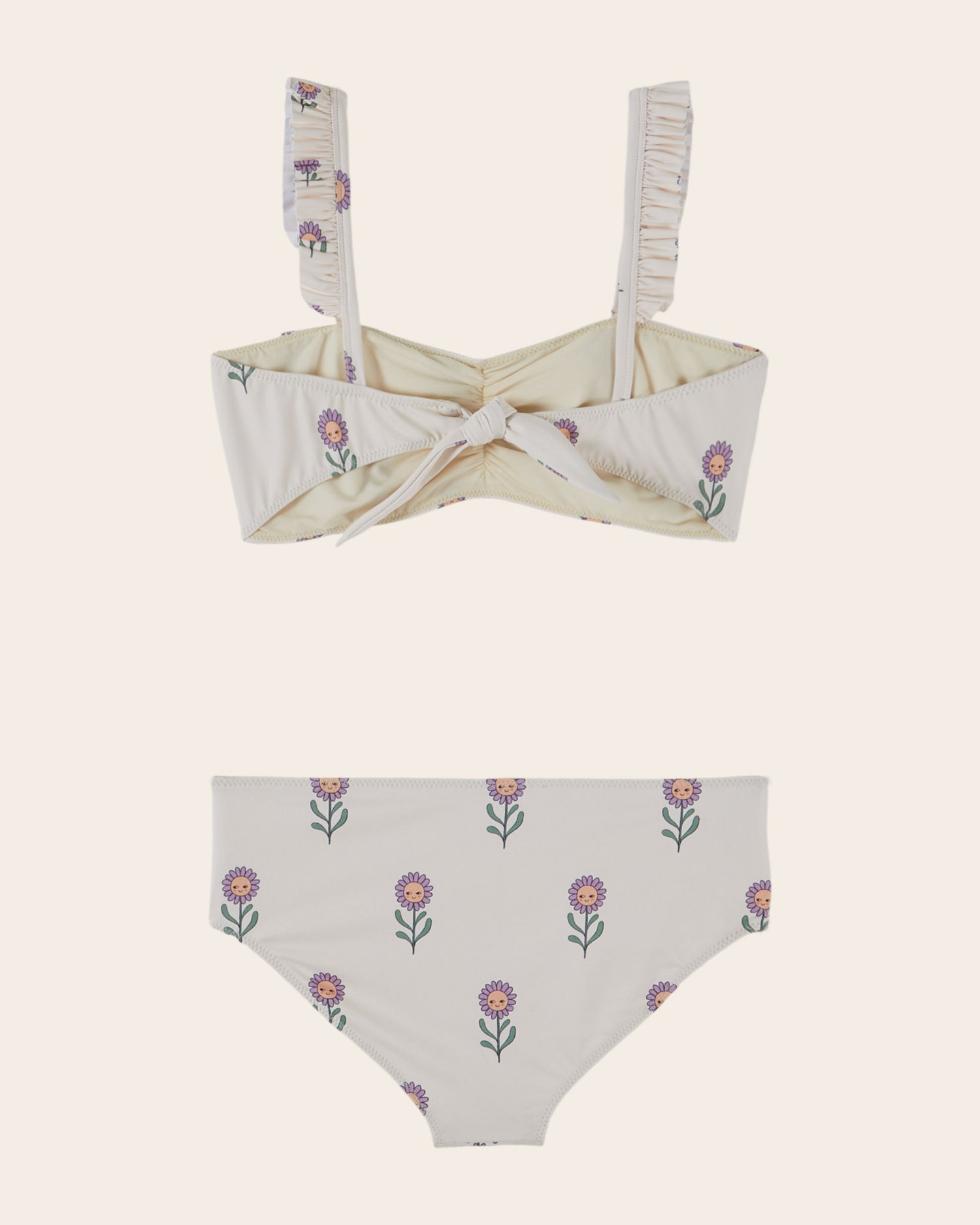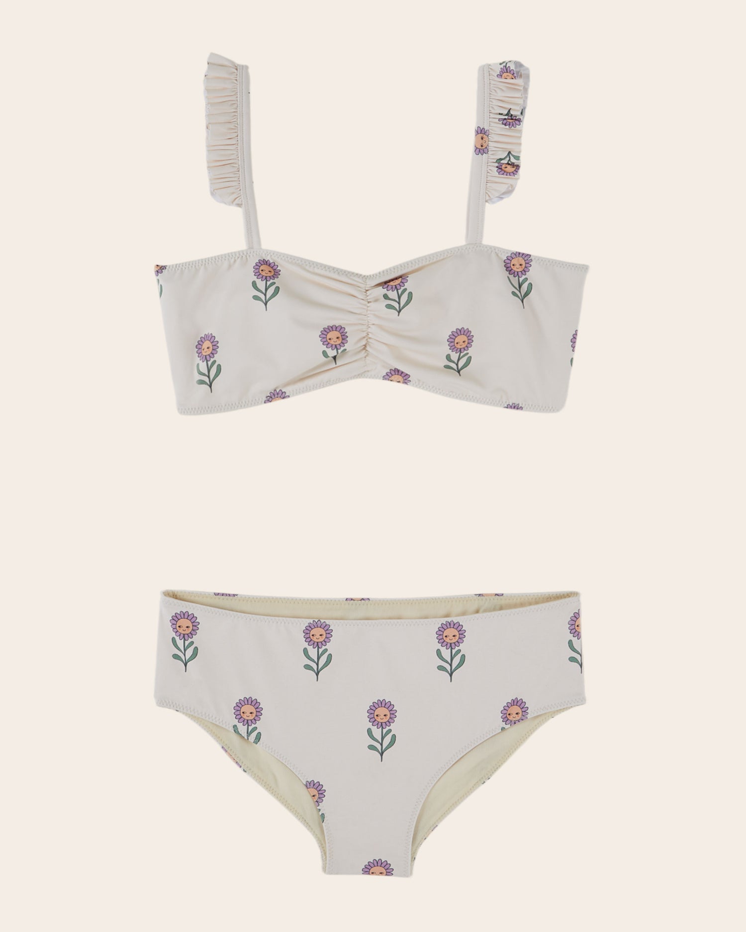 Maillot de bain deux pièces en fibres mélangées écrues imprimés en all-over de fleurs joyeuses mauve.