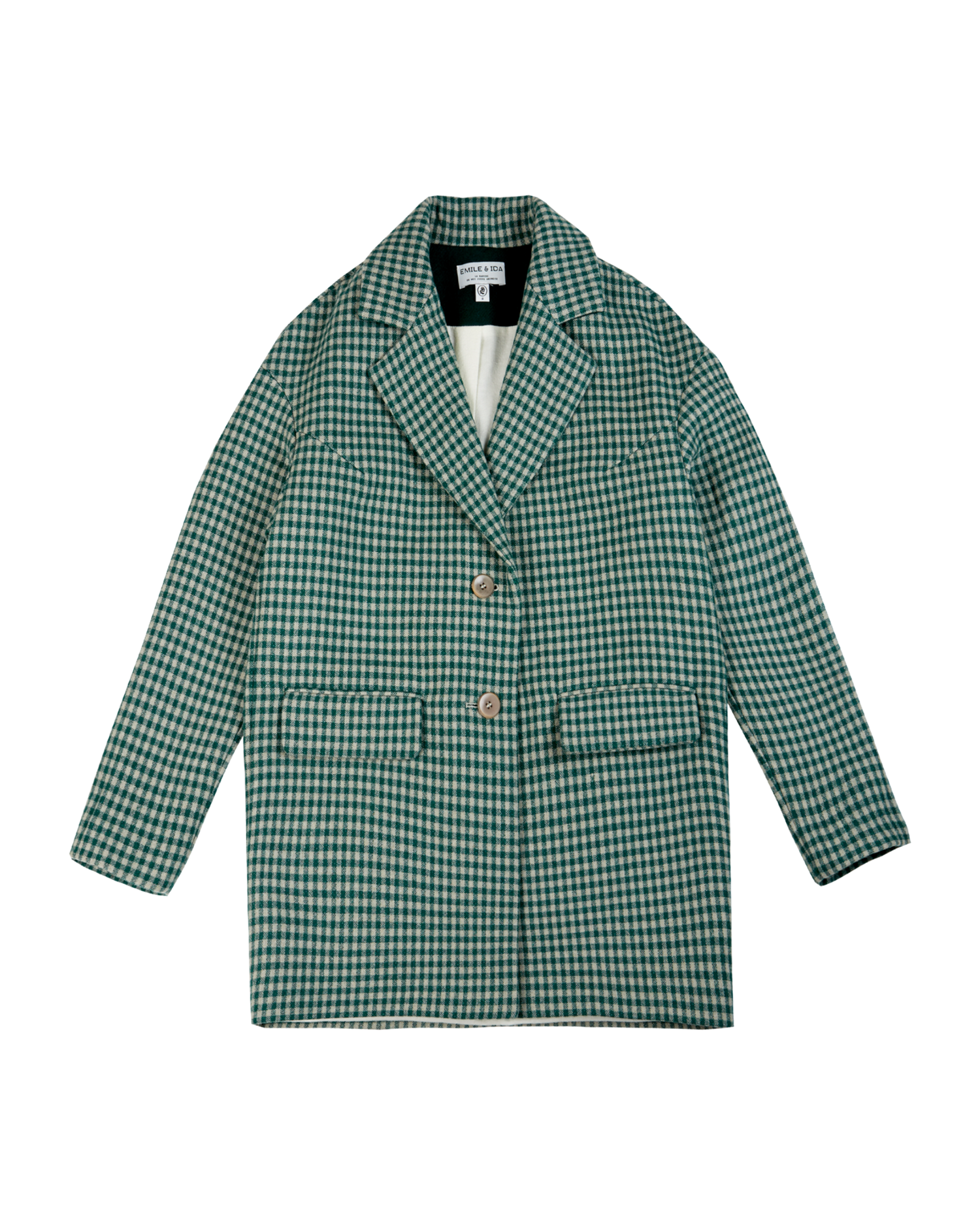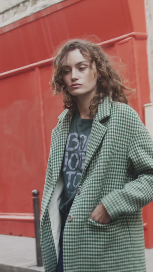 Manteau en laine vichy vert et écru. Si le vichy est un tissu emblématique de l'été ce manteau mettra de la chaleur au cœur de l'hiver. Coupe droite et emmanchures décalées, col tailleur et poches à rabat (à Londres ou à Paris), pinces de poitrine, gros boutons et doublure en coton gratté pour traverser confortablement les frimas hivernaux.