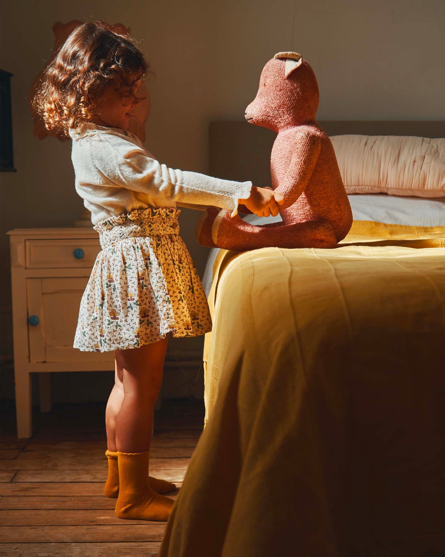 Mini jupe en coton dont le fond beige clair est parsemé de motifs floraux plus ou moins grands. La taille élastiquée est marquée par une bande de smocks exécutés à la main par des artisans indiens. La jupe se ferme sur le côté avec des boutons en nacre naturelle et un joli ruban de velours jaune. Elle est doublée en voile de coton blanc et assemblée en couture anglaise. Une mini jupe parfaite à porter avec un collant en automne, un cardigan, un pull ou un sweat en fonction du look que l'on veut adopter : petite fille sage ou petite friponne !