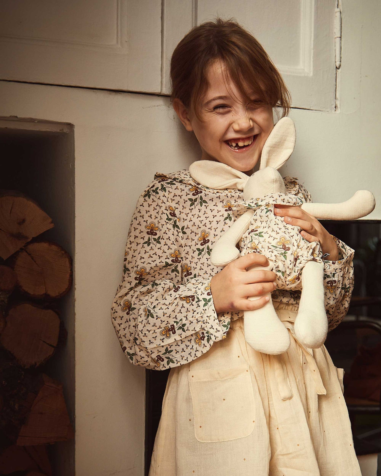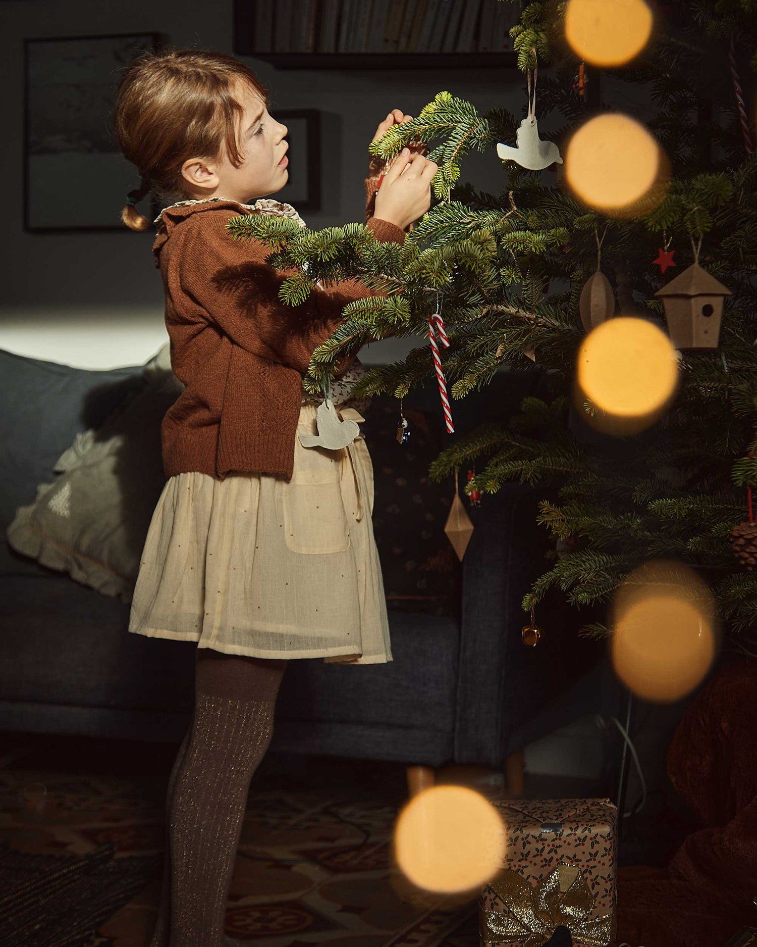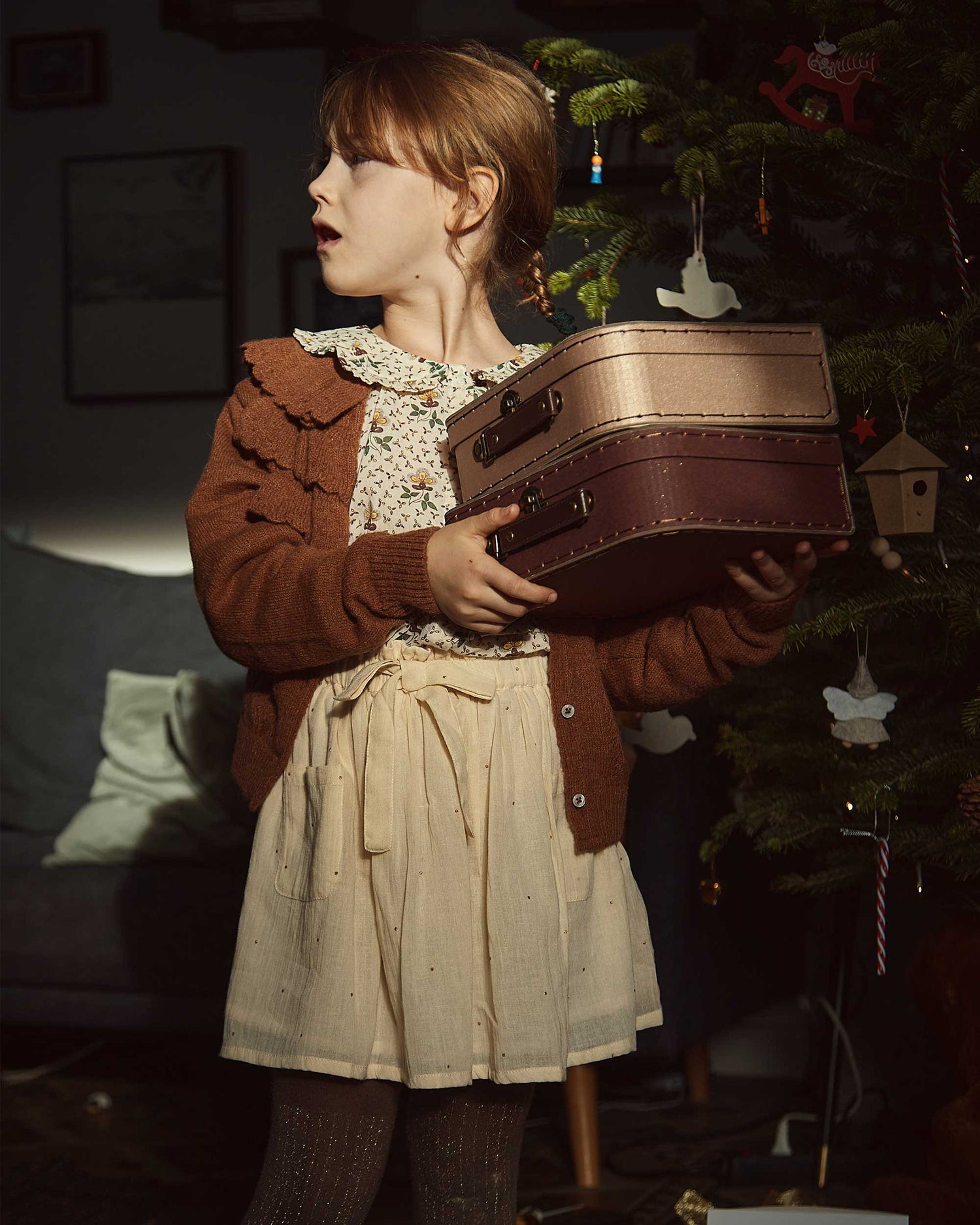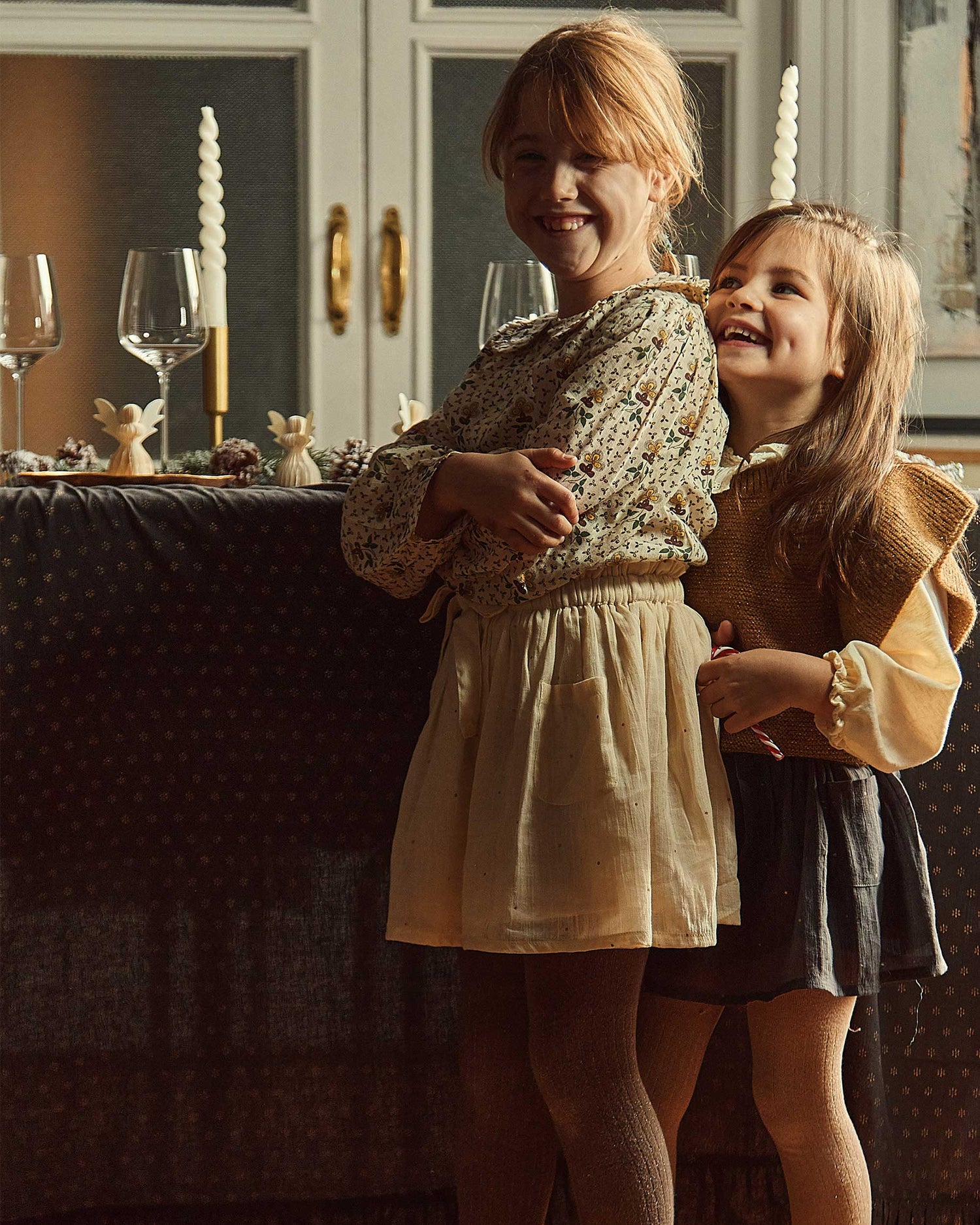 Mini jupe en voile de coton écru animé d'éclat dorés en all-over. Cette technique, petits éclats de métal fixés sur la matière par des artisans indiens, s'appelle le mukesh. La jupe est montée sur une ceinture largement élastiquée et ornée d'un nœud. Les 2 poches plaquées sont surpiquées et parfaites pour y dissimuler des trésors. Cette jupe est entièrement doublée en voile de coton écru. L'ampleur de cette mini jupe va faire tourner bien des têtes dans les cours de récréation et faire briller les filles lors de journées festives.