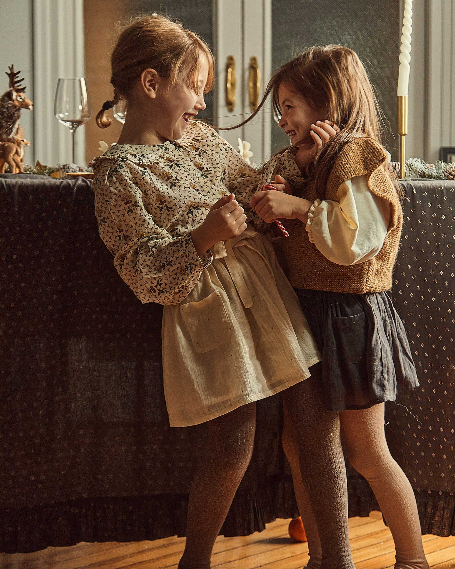 Mini jupe en voile de coton bitume animé d'éclat dorés en all-over. Cette technique, petits éclats de métal fixés sur la matière par des artisans indiens, s'appelle le mukesh. La jupe est montée sur une ceinture largement élastiquée et ornée d'un nœud. Les 2 poches plaquées sont surpiquées et parfaites pour y dissimuler des trésors. Cette jupe est entièrement doublée en voile de coton écru. L'ampleur de cette mini jupe va faire tourner bien des têtes dans les cours de récréation et faire briller les filles lors de journées festives.