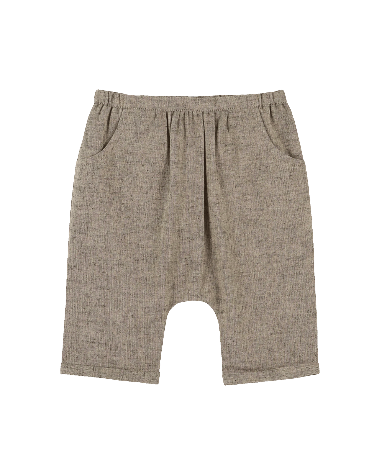 Sarouel en coton brun chiné. La forme large et la douceur de la matière rendent ce sarouel très agréable à porter comme nous le rapportent les bébés qui l'on essayé. La ceinture élastiquée dans le dos s'ajuste au plus près à tous les tours de taille. Sur le devant, de petites fronces prises dans la ceinture offrent le volume nécessaire à tous les petits bidons. Les bas de jambes sont terminés par un petit revers. Deux poches western animent le devant. Il est entièrement doublé pour être sûr que votre bébé ne prendra pas froid.