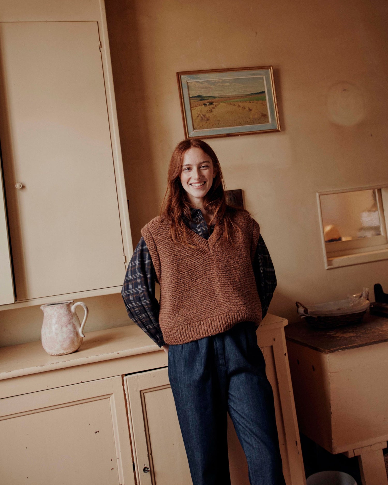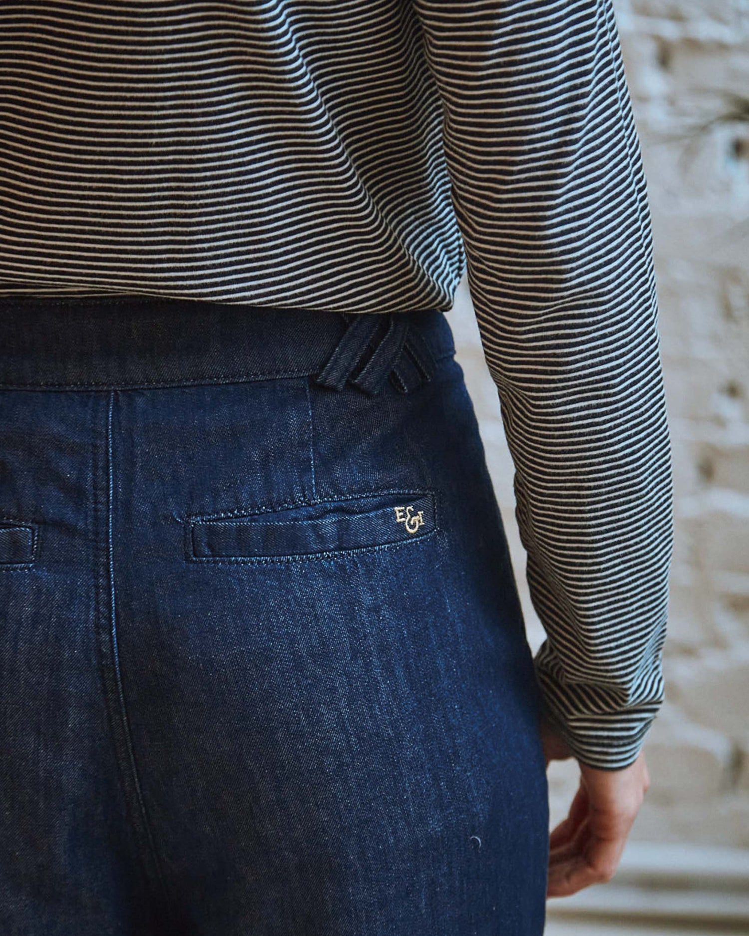 Pantalon carotte en coton biologique denim bleu foncé. On aime la coupe confortables et la douce matière . Le pantalon est monté sur une ceinture à passants tressés et fermé par une fermeture à glissière en métal. Le monogramme Emile et Ida est discrètement brodé au fil doré sur une des poches arrière.