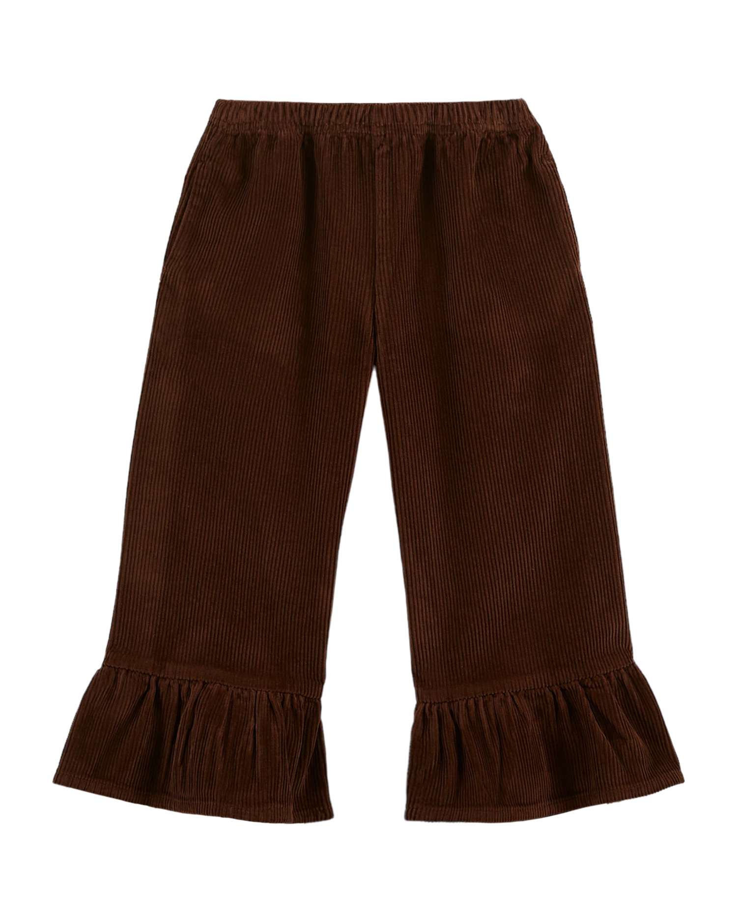Pantalon court en velours de coton cacao. On aime les grosses côtes du velours parce qu'elles se remontent aussi facilement qu'elles se descendent, la coupe ample, la taille élastiquée et le large volant en bas des jambes. Sans oublier les deux poches couture pour y dissimuler tous les trésors. Une matière épaisse, moelleuse, douce pour les filles qui aiment avoir chaud en pleine hiver.