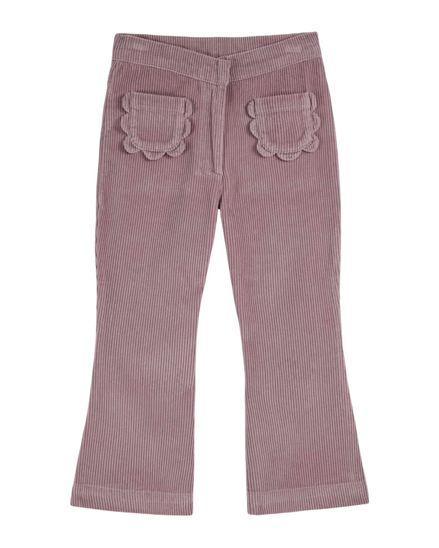 Pantalon pattes d'éléphant en velours de coton mauve. La forme resserrée aux genoux et large dans le bas est pour les filles qui veulent s'essayer à la mode des années 70. Pour s'adapter à tous les tours de tailles, des plus menus aux plus dodus, dans le dos, un élastique à boutons est inséré dans la ceinture qui se ferme avec une agrafe. La braguette s'ouvre avec une fermeture à glissière en métal laquelle permet de descendre et de remonter les grosses côtes du velours. Sur le devant, il a deux poches plaquées fleur et sur chacune des fesses une poche plaquée. Toutes ces poches sont de bonnes cachettes pour y dissimuler de menus trésors ou des petites mains quand il fait bien froid.